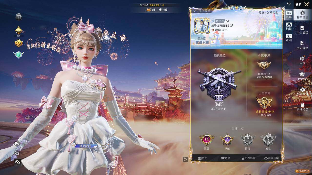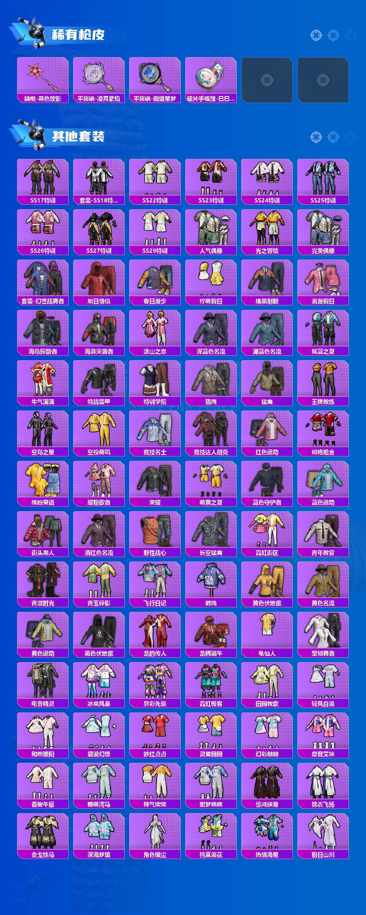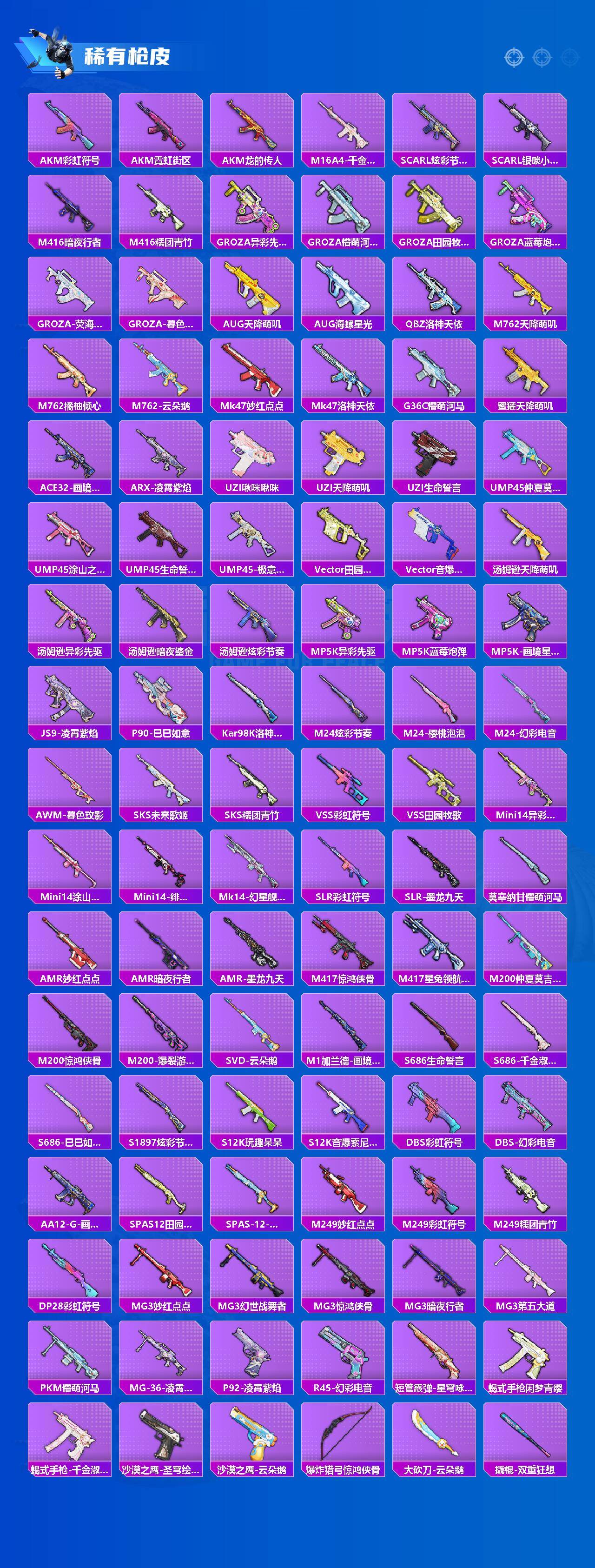 - [11548746]15粉装 10特效枪 3载具 11印记 可二次 可修改实名 身法装备:都市猎人,暗影哥特(红眼罩),萌熊伴侣背包(粉熊背包) 优质装备:宝马X6 M(曼岛绿),玛莎拉蒂Ghibli(粉),甜心巧克力,宾利BATUR(极速紫),都市猎人,萌熊伴侣背包(粉熊背包),M416心之恋语,梦幻火箭(新101)(新火箭少女101粉色套装),宝贝奶油派,天使彩虹糖,SCAR-L童趣迷兔,炙焰红王,冰霜白皇,AUG星之彼岸,UMP45相思残雪(UMP45-相思残雪),相思残雪,AKM梦之光华,P90粉樱探戈,AUG超新星,AKS-74U-信仰神谕,冷漠罗丽,Kar98K-巳巳如意 热门装扮:薄荷物语,傲雪凌霜,海螺星光,仲夏莫吉托,天星战神,幻影,白兰星,兔兔白日梦,胖达圆圆,胖达团团,罗小黑,鹰眼刺客,万圣娃娃,都市猎人 稀有枪皮:DP-28-豹影疾电 六级特效枪:六级M416-心之恋语,六级AKS-74U-信仰神谕 五级特效枪:五级SCAR-L-童趣迷兔,五级Kar98K-巳巳如意,五级DP-28-豹影疾电,五级P90-粉樱探戈,五级AUG-超新星,五级UMP45-相思残雪,五级AKM-梦之光华 一级特效枪:一级AUG-星之彼岸 紫色装扮:田园牧歌,轻风白浪,和煦暖阳,SS22特训,SS23特训,幻彩翩翩,妙红点点,摩登艾咪,香榭午后,娇憨猪猪,梦幻奶油,萌趣咩咩,SS21特训,SS31特训套装,冷焰舞者,SS30特训套装,云朵鹅,彩虹兔,雪绒豹,SS33特训套装,青涩时光,顶瓜瓜,时希公主,SS20特训,星梦畅游,微雨春柳,暖风夏荷,猎梦纪元,飞驰魅影,音速流光,SS19特训,甜心亚梦,虚音幻奏,野性山猫,野性战心,长空猛禽,霓虹街区,青年教官,缤纷果语,街头潮人,飞行日记,魅力单车,麻辣教官,黄色名流,黑色伏地魔,龙的传人,龟仙人,香桃花海,沙漠毒蛇,极地朋克,柠萌假日,海岛探路者,涂山之恋,坚韧舞者,夏日倾情,完美偶像,帅气教官,幻世战舞者,探宝勇士,湖蓝色名流,白熊同盟,白色伏地魔,破晓战魂,破蛋小黄鸡,空岛之星,竞技达人朋克,甜蜜熊情侣,王牌教练,牛气冲天,炫蓝之夏,牛气满满,猛禽,猎鹰,SS29特训,星途旅人,SS28特训,异域银装,鱼渊荷华,玉兔迎春,燕燕于飞,巳巳如意,海琴烟,风玲,青团波波,糖糖葫芦,棉花软糖,竞技名士,摩登魅猫,暗影哥特(红眼罩),街头风暴