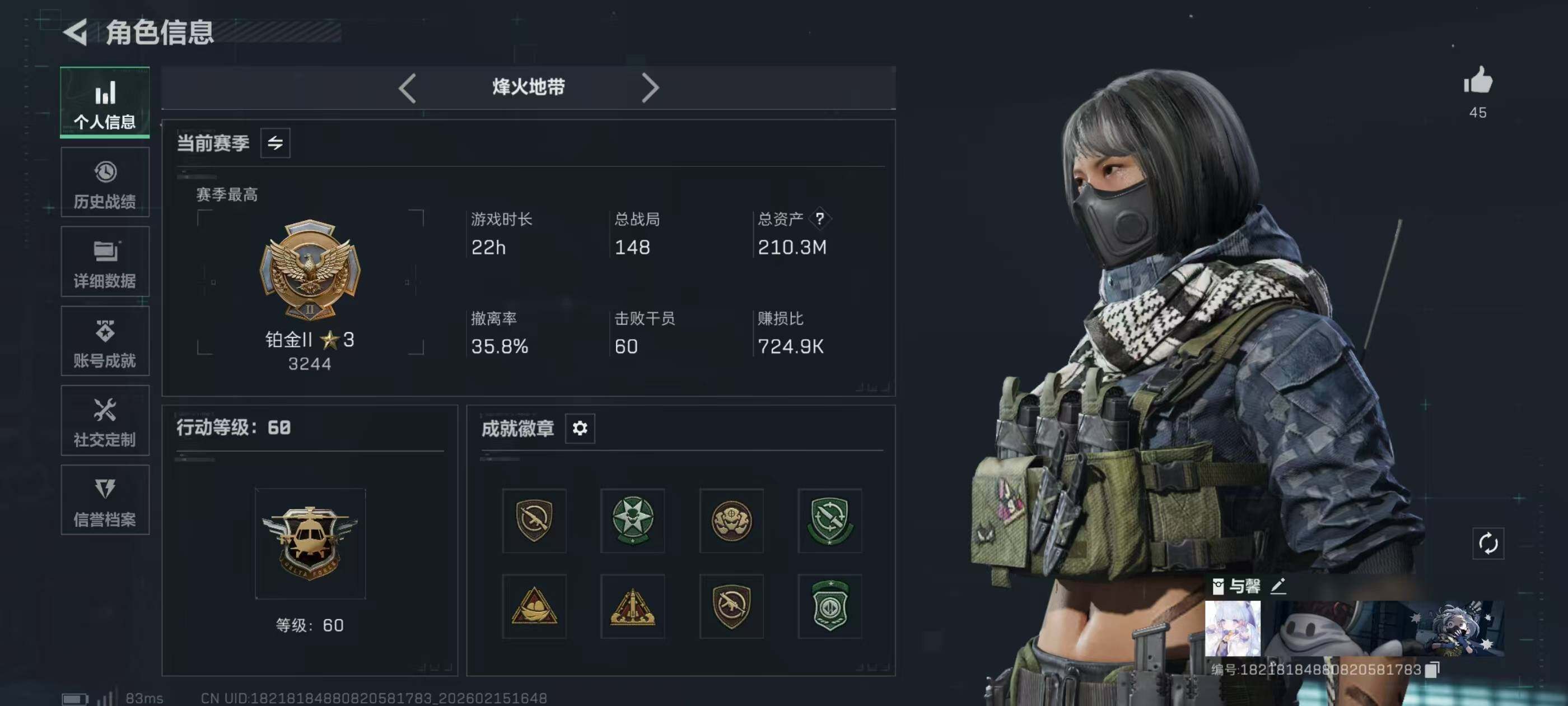 [16856639]【店主推荐捡漏号!可直接换绑】210m总资产-69882k哈伏币-60烽火等级-铂金-40战场等级-尉官