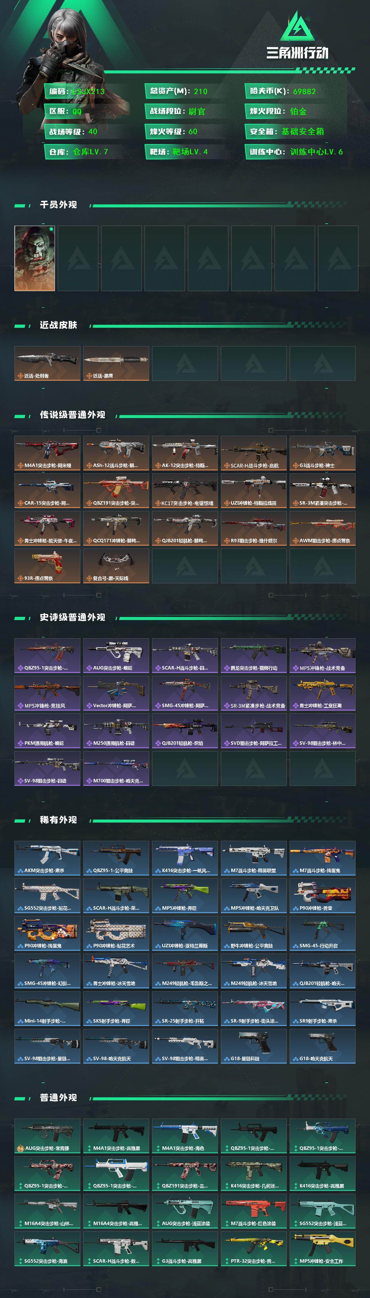 - [11524641]总资产:76 可二次 可修改实名 烽火地带段位:铂金 全面战场段位:列兵 哈夫币:65.137 史诗武器皮肤:AKM突击步枪-林中猎手,SVD狙击步枪-暗夜猎手,M1014霰弹枪-林中猎手,M250通用机枪-囚徒,沙漠之鹰-曙光,PKM通用机枪-英雄