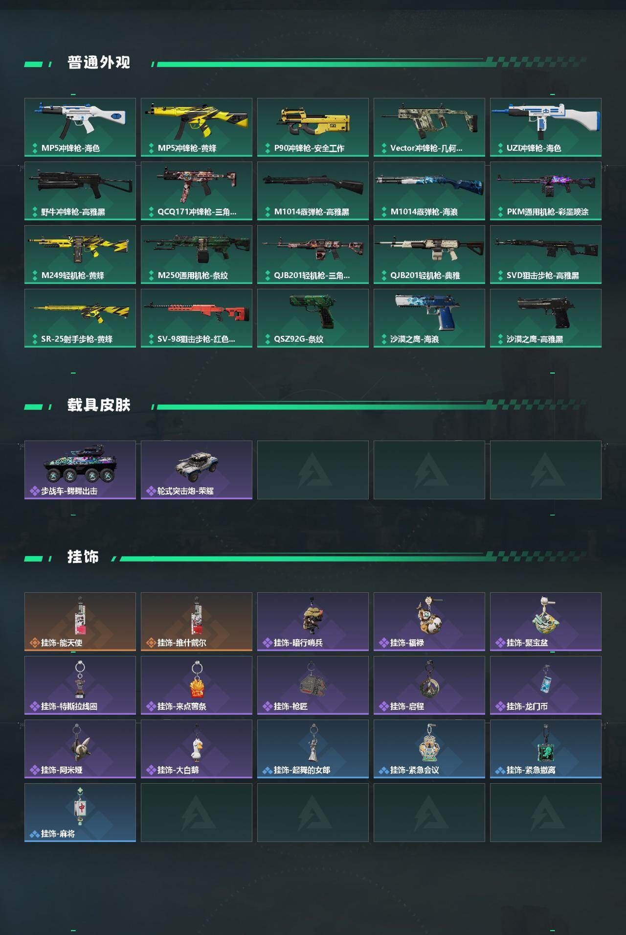 【稀有外观】:AKM突击步枪-肃杀,QBZ95-1突击步枪-公平竞技,K416突击步枪-一帆风顺,M7战斗步枪-精英联盟,M7战斗步枪-捣蛋鬼,SG552突击步枪-贴花艺术,SCAR-H战斗步枪-荣耀列队,MP5冲锋枪-弄臣,MP5冲锋枪-哈夫克卫队,P90冲锋枪-黄昏,P90冲锋枪-捣蛋鬼,P90冲锋枪-贴花艺术,UZI冲锋枪-亚特兰蒂斯,野牛冲锋枪-公平竞技,SMG-45-行动开启,SMG-45冲锋枪-幻影结构,勇士冲锋枪-冰天雪地,M249轻机枪-毛鲁斯之力,M249轻机枪-冰天雪地,QJB201轻机枪-哈夫克卫队,Mini-14射手步枪-荣耀列队,SKS射手步枪-弄臣,SR-25射手步枪-开拓,SR-9射手步枪-街头涂鸦,SR9射手步枪-肃杀,SV-98狙击步枪-星链科技,SV-98狙击步枪-哈夫克航天,SV-98狙击步枪-精英联盟,G18-星链科技,G18-哈夫克航天