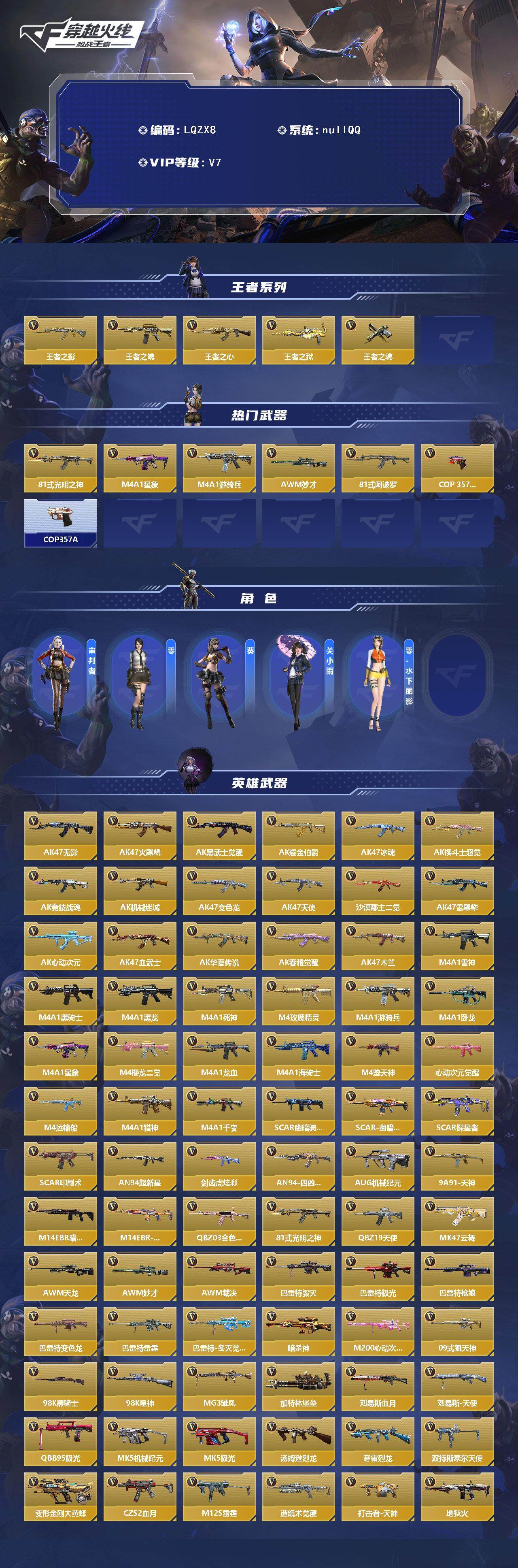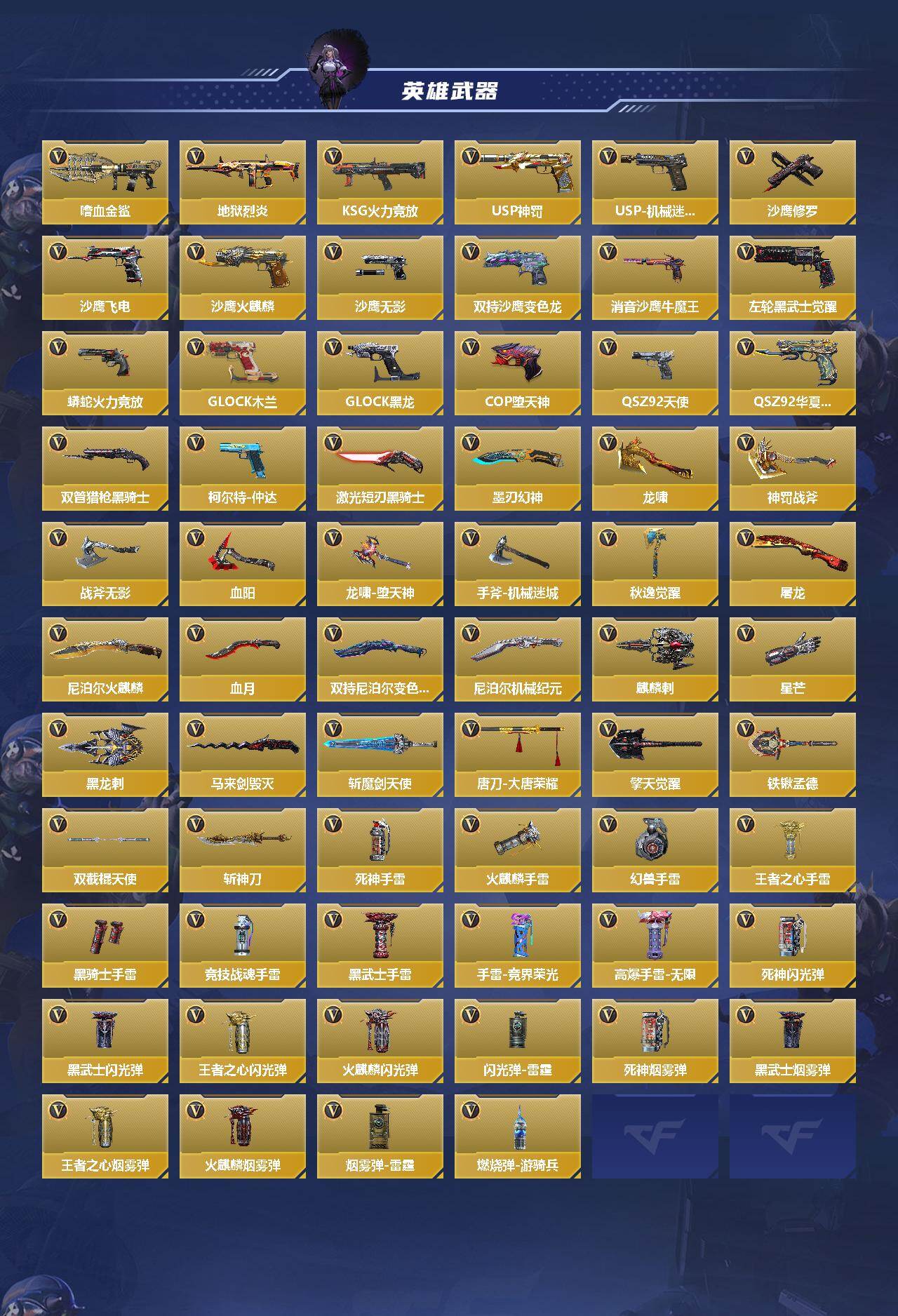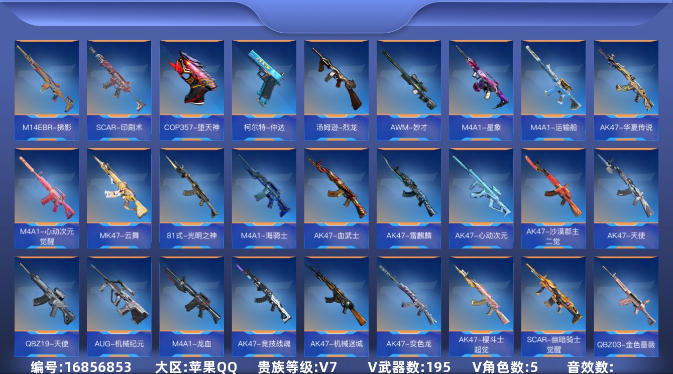【英雄武器】:AK47-无影*2,AK47-火麒麟,AK47-黑武士觉醒,AK47-耀金伯爵,AK47-冰魂,AK47-樱斗士-超觉,AK47-竞技战魂,AK47-机械迷城,AK47-变色龙,AK47-天使,AK47-沙漠郡主-二觉,AK47-雷麒麟*2,AK47-心动次元,AK47-血武士*2,AK47-华夏传说,AK47-春雅觉醒,AK47-木兰,M4A1-雷神*3,M4A1-黑骑士,M4A1-黑龙,M4A1-死神,M4A1-玫瑰精灵,M4A1-游骑兵,M4A1-卧龙,M4A1-星象,M4A1-樱龙·二觉,M4A1-龙血,M4A1-海骑士,M4A1-堕天神,M4A1-心动次元觉醒,M4A1-运输船,M4A1-猎神,M4A1-千变,SCAR-幽暗骑士,SCAR-幽暗骑士觉醒,SCAR-探星者,SCAR-印刷术*2,AN94-超新星,剑齿虎-炫彩,AN94-四凶觉醒,AUG-机械纪元,9A91-天神,M14EBR-暗夜,M14EBR-拂影,QBZ03-金色蔷薇,81式-光明之神,QBZ19-天使,MK47-云舞,AWM-天龙,AWM-妙才,AWM-裁决,巴雷特-毁灭*4,巴雷特-极光*7,巴雷特-枪娘,巴雷特-变色龙,巴雷特-雷霆,巴雷特-冬灭觉醒,暗杀神,M200-心动次元,09式狙-天神,98K-黑骑士,98K-星神,MG3-雏凤,加特林-堡垒*2,刘易斯-血月,刘易斯-天使,QBB95-极光,MK5-机械纪元,MK5-极光,汤姆逊-烈龙,寒霜烈龙,双持斯泰尔-天使,QCW05-变形金刚·大黄蜂*2,CZS2-血月,M12S-雷霆,PP19野牛-造纸术觉醒,打击者-天神,地狱火*2,嗜血金鲨,地狱烈炎,KSG-火力竞放,USP-神罚,USP-机械迷城,沙鹰-修罗*2,沙鹰-飞电,沙鹰-火麒麟,沙鹰-无影*3,双持沙鹰-变色龙,消音沙鹰-牛魔王,左轮-黑武士觉醒,蟒蛇-火力竞放,改装GLOCK-木兰,改装GLOCK-黑龙,COP 357-堕天神,QS