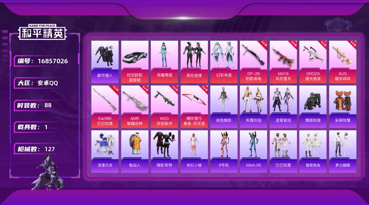 [16857026]【特价出售/店主推荐】安卓 手Q-3粉装-8特效枪-1载具-1粉色飞行器-38676热力值-3王牌印记-88套装-127枪皮 【热门品类】:套装-浪漫天命,套装-都市猎人,套装-龟仙人,套装-暗影哥特,套装-粉红小猪,角色-8号机,角色-Mark.06 【粉色套装】:粉装-英伦信使,粉装-幻彩电音,角色-异瞳寒姬 【粉色枪皮等级】:M416-风花雪月(五级),GROZA-镜光银凌(五级),AUG-暖羊咩咩(五级),Kar98K-巳巳如意(五级),AMR-智耀战神(五级),DP-28-豹影疾电(五级),MG3-突变脉冲(五级),爆炸猎弓-拳皇·狂花道(五级) 【粉色载具】:时空跃影(星辉银) 【粉色枪皮】:M416-风花雪月,GROZA-镜光银凌,AUG-暖羊咩咩,Kar98K-巳巳如意,AMR-智耀战神,DP-28-豹影疾电,MG3-突变脉冲,爆炸猎弓-拳皇·狂花道 【粉色降落伞】:守护天翼降落伞,BEARBRICK降落伞,未来领航者降落伞,临安公主降落伞,冷漠罗丽降落伞,炫彩糖果降落伞 【稀有套装】:套装-龟仙人,套装-巳巳如意,套装-雏菊兔兔,套装-萝兰蝴蝶,套装-行星泡泡,套装-糖糖葫芦,套装-青团波波,套装-棉花软糖,角色-许七安,角色-临安公主,套装-裁决天象,套装-燕燕于飞,套装-鱼渊荷华,角色-海琴烟,套装-紫幽梦,套装-蓝冰羽,套装-诡诞巡游,角色-时希公主,角色-灵公主,角色-乐音,套装-朱霞炽焰,套装-凌霄紫焰,角色-绯色魅影,套装-炫彩糖果 【稀有枪皮】:AUG-冰晶雪宝,AKM-破晓战魂,AKM-玄冥寒域,SCAR-L-夜灯,SCAR-L-炫彩节奏,SCAR-L-冷漠罗丽,M416-蓝色火焰,GROZA-影袭,AUG-天降萌叽,AUG-耀粉歌者,QBZ-彩虹符号,G36C-桃粉嫣然,AC-VAL-天降萌叽,蜜獾-天降萌叽,ARX-凌霄紫焰,UZI-影袭,UMP45-夜灯,汤姆逊-天降萌叽,汤姆逊-樱桃泡泡,AKS-74U-鬼刀,JS9-凌霄紫焰,P90-巳巳如意,Kar98K-影袭,M24-影袭,M24-幻彩电音,SKS-迅猛狂鲨,VSS-星之彼岸,Mini14-梦幻火箭,Mini14-耀粉歌者,MK20-H-净心行者,M200-爆裂游戏,SVD-冷漠罗丽,S686-彩虹符号,S686-巳巳如意,S12K-玩趣呆呆,S12K-夜灯,DBS-