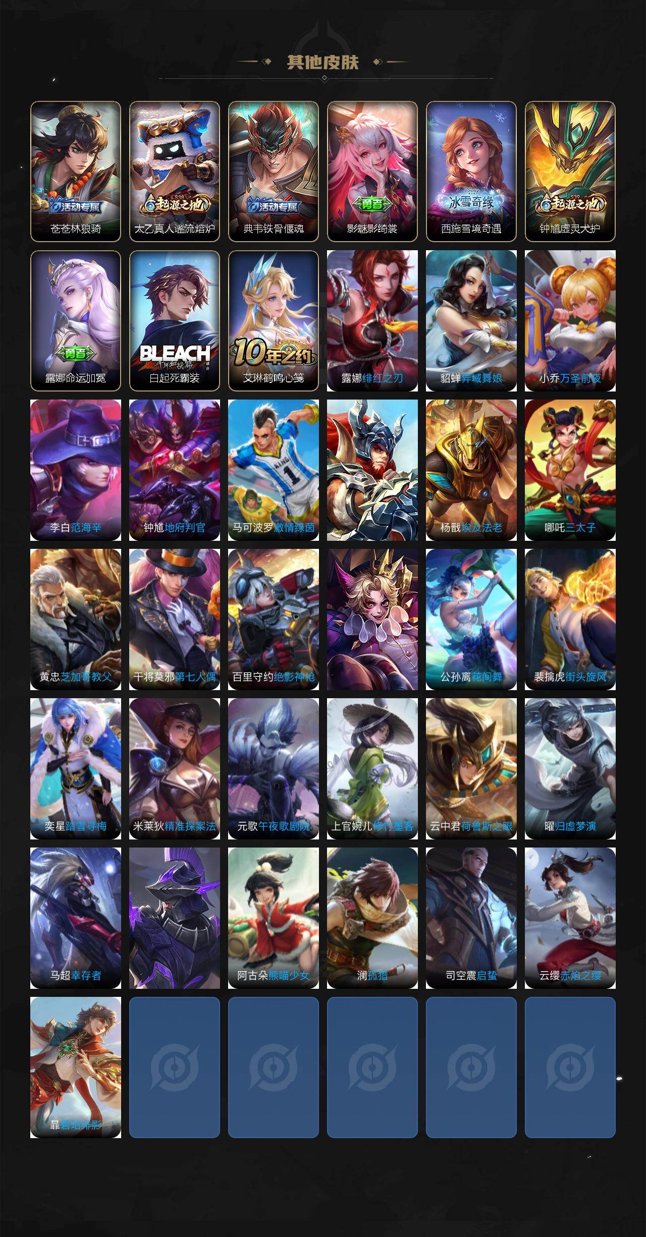 【其他皮肤】:项羽海滩派对,韩信教廷特使,韩信街头霸王,露娜哥特玫瑰,阿轲爱心护理,达摩大发明家,芈月红桃皇后,扁鹊救世之瞳,妲己少女阿狸,亚瑟死亡骑士,达摩拳王,甄姬花好人间,刘备万事如意,后羿阿尔法小队,狄仁杰阴阳师,关羽龙腾万里,钟无艳海滩丽影,曹操烛龙,老夫子功夫老勺,狂铁御狮,米莱狄御霄,沈梦溪鲨炮海盗猫,夏侯惇朔风刀,弈星混沌棋,明世隐疑决卦,老夫子醍醐杖,鬼谷子原初探秘者,狄仁杰万华元夜,钟馗驱傩正仪,鲁班大师乓乓大师,桑启海盐诗旅,鲁班大师探海日志,程咬金群星魔术团,东皇太一噬灭天穹,老夫子百相守梦,干将莫邪雾都夜雨,苍苍林狼骑,太乙真人谧流熔炉,典韦铁骨偃魂,影魅影绮裳,西施雪境奇遇,钟馗虚灵犬护,露娜命运加冕,白起死霸装,艾琳鹤鸣心笺,露娜绯红之刃,貂蝉异域舞娘,小乔万圣前夜,李白范海辛,钟馗地府判官,马可波罗激情绿茵,苍维京掠夺者,杨戬埃及法老,哪吒三太子,黄忠芝加哥教父,干将莫邪第七人偶,百里守约绝影神枪,百里玄策威尼斯狂欢,公孙离花间舞,裴擒虎街头旋风,弈星踏雪寻梅,米莱狄精准探案法,元歌午夜歌剧院,上官婉儿修竹墨客,云中君荷鲁斯之眼,曜归虚梦演,马超幸存者,蒙恬秩序猎龙将,阿古朵熊喵少女,澜孤猎,司空震启蛰,云缨赤焰之缨,暃碧珀绯影