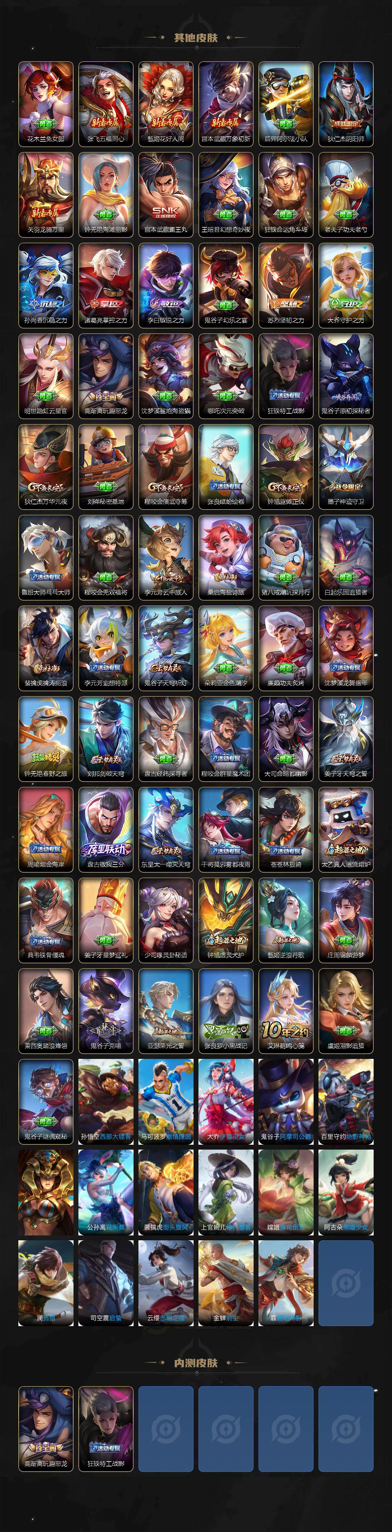 【其他皮肤】:韩信教廷特使,韩信街头霸王,露娜哥特玫瑰,达摩大发明家,赵云忍炎影,白起白色死神,牛魔西部大镖客,武则天东方不败,安琪拉玩偶对对碰,孙膑天使之翼,亚瑟死亡骑士,达摩拳王,花木兰兔女郎,张飞五福同心,甄姬花好人间,宫本武藏万象初新,后羿阿尔法小队,狄仁杰阴阳师,关羽龙腾万里,钟无艳海滩丽影,宫本武藏霸王丸,王昭君幻想奇妙夜,狂铁命运角斗场,老夫子功夫老勺,孙尚香沉稳之力,诸葛亮掌控之力,李白敏锐之力,鬼谷子幻乐之宴,苏烈坚韧之力,大乔守护之力,明世隐虹云星官,高渐离玩趣恶龙,沈梦溪鲨炮海盗猫,哪吒次元突破,狂铁特工战影,鬼谷子原初探秘者,狄仁杰万华元夜,刘禅秘密基地,程咬金演武夺筹,张良缤纷绘卷,钟馗驱傩正仪,墨子神迹守