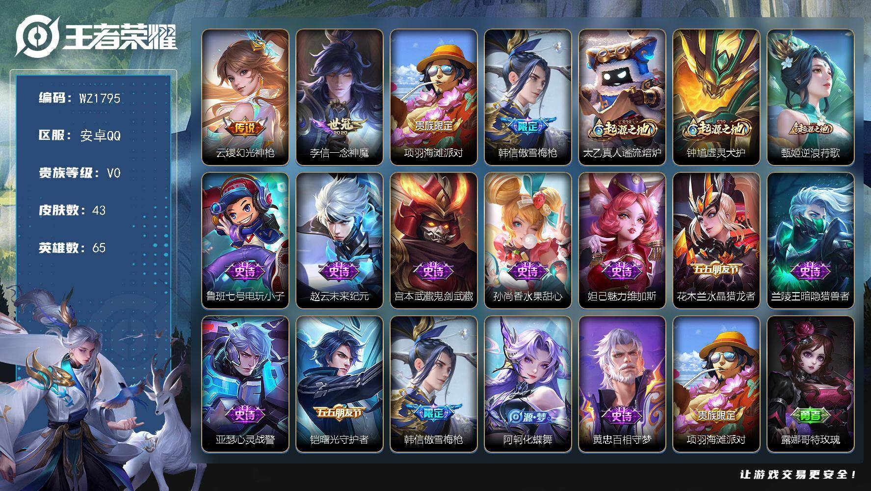- [13345991]【店主推荐捡漏号!可直接换绑】安卓Q-V4-最强王者段位-125英雄-168皮肤 -4传说-45史诗 【传说皮肤】:妲己愿照众生和,桑启鸣野蒿,干将莫邪久胜战神,后羿黄金射手座 【限定皮肤】:大乔绒语心约,姜子牙天穹之誓,狄仁杰阴阳师,孙尚香蔷薇恋人,庄周高山流水,元歌无心,甄姬游园惊梦,狄仁杰万华元夜,达摩沙漠行僧,项羽海滩派对,兰陵王金庭之子,李元芳云中旅人,钟馗驱傩正仪,鬼谷子五谷丰年,苏烈千军破阵,弈星混沌棋,梦奇顽趣,沈梦溪大漠名商,裴擒虎擒涛扼浪,鲁班大师探海日志,桑启海盐诗旅,阿古朵江河有灵,张良古海寻踪,鬼谷子天穹祈灯,姬小满妄想食味,沈梦溪龙舞盛年,周瑜熔金海岸 【赛季限定】:狄仁杰万华元夜,达摩沙漠行僧,兰陵王金庭之子,张良古海寻踪,李元芳云中旅人,钟馗驱傩正仪,苏烈千军破阵,弈星混沌棋,梦奇顽趣,沈梦溪大漠名商,裴擒虎擒涛扼浪,鲁班大师探海日志,桑启海盐诗旅,鬼谷子天穹祈灯,姜子牙天穹之誓 【史诗皮肤】:赵云未来纪元,貂蝉圣诞恋歌,甄姬冰雪圆舞曲,王昭君偶像歌手,宫本武藏鬼剑武藏,孙尚香蔷薇恋人,孙尚香水果甜心,嬴政摇滚巨星,妲己魅力维加斯,妲己女仆咖啡,墨子金属风暴,吕布圣诞狂欢,刘禅绅士熊喵,曹操幽灵船长,吕布末日机甲,张飞乱世虎臣,花木兰水晶猎龙者,小乔缤纷独角兽,兰陵王暗隐猎兽者,甄姬游园惊梦,安琪拉心灵骇客,百里守约特工魅影,蔡文姬舞动绿茵,李元芳逐浪之夏,阿轲节奏热浪,伽罗箭羽风息,狄仁杰鹰眼统帅,大乔白蛇,不知火舞魅语,庄周高山流水,貂蝉唤灵魅影,鬼谷子五谷丰年,元歌无心,梦奇顽趣,阿古朵江河有灵,姬小满妄想食味,牛魔星界战将,赵怀真器灵浮梦炉,阿轲化蝶舞,刘禅鸭鸭历险记,后羿石田雨龙,黄忠百相守梦,西施织梦人,公孙离涂山容容,女娲万灵启世 【其他皮肤】:项羽海滩派对,韩信教廷特使,韩信街头霸王,露娜哥特玫瑰,达摩大发明家,赵云忍炎影,芈月红桃皇后,白起白色死神,宫本武藏未来纪元,孙膑天使之翼,妲己少女阿狸,亚瑟死亡骑士,达摩拳王,花木兰兔女郎,张飞五福同心,甄姬花好人间,宫本武藏万象初新,后羿阿尔法小队,狄仁杰阴阳师,关羽龙腾万里,钟无艳海滩丽影,宫本武藏霸王丸,王昭君幻想奇妙夜,狂铁命运角斗场,孙尚香沉稳之力,诸葛亮掌控之力,李白敏锐之力,鬼谷子幻乐之宴,大乔守护之力,明世隐虹云星官,吕布野性能量,沈梦溪鲨炮海盗猫,姜子牙炽