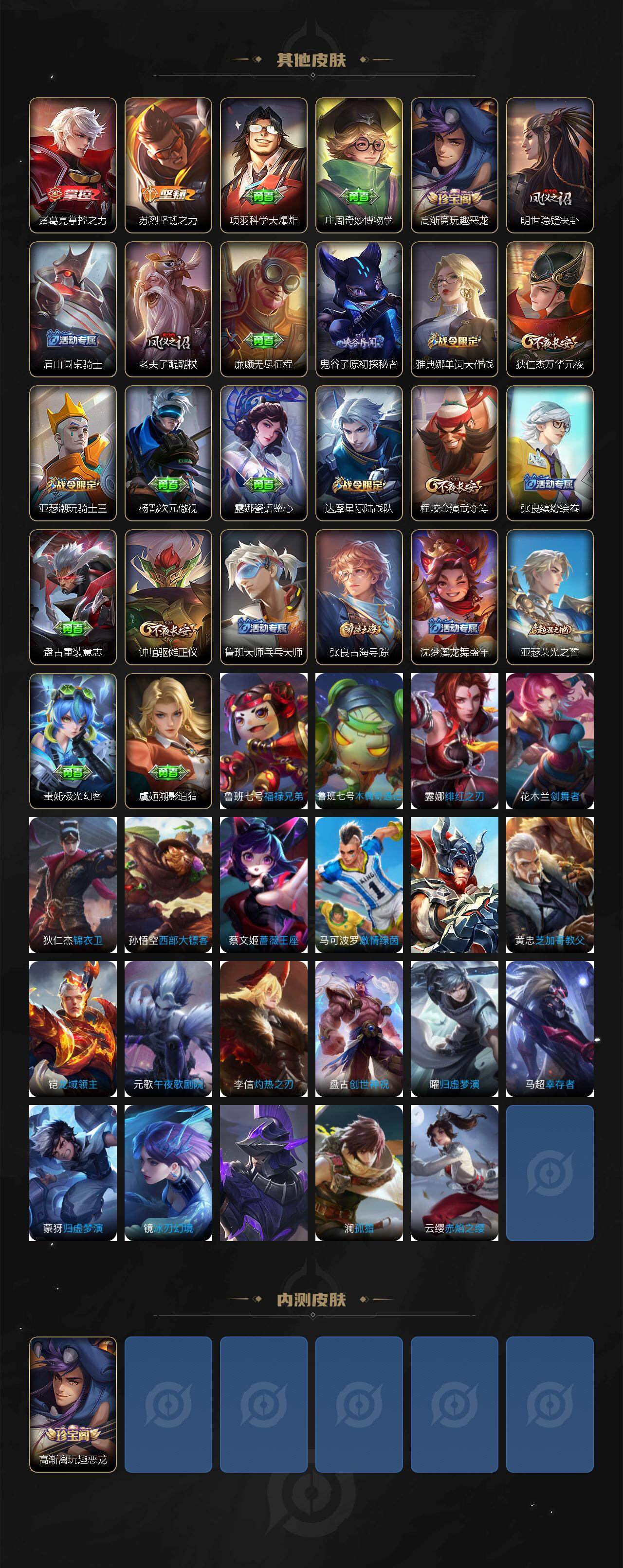 【其他皮肤】:项羽海滩派对,韩信教廷特使,韩信街头霸王,露娜哥特玫瑰,阿轲爱心护理,赵云白执事,程咬金星际陆战队,白起白色死神,孙膑天使之翼,亚瑟死亡骑士,花木兰兔女郎,刘备万事如意,宫本武藏万象初新,后羿阿尔法小队,狄仁杰阴阳师,刘备纽约教父,刘备汉昭烈帝,钟无艳海滩丽影,诸葛亮掌控之力,苏烈坚韧之力,项羽科学大爆炸,庄周奇妙博物学,高渐离玩趣恶龙,明世隐疑决卦,盾山圆桌骑士,老夫子醍醐杖,廉颇无尽征程,鬼谷子原初探秘者,雅典娜单词大作战,狄仁杰万华元夜,亚瑟潮玩骑士王,杨戬次元傲视,露娜瓷语鉴心,达摩星际陆战队,程咬金演武夺筹,张良缤纷绘卷,盘古重装意志,钟馗驱傩正仪,鲁班大师乓乓大师,张良古海寻踪,沈梦溪龙舞盛年,亚瑟荣光之誓,蚩奼极光幻客,虞姬溯影追猎,鲁班七号福禄兄弟,鲁班七号木偶奇遇记,露娜绯红之刃,花木兰剑舞者,狄仁杰锦衣卫,孙悟空西部大镖客,蔡文姬蔷薇王座,马可波罗激情绿茵,