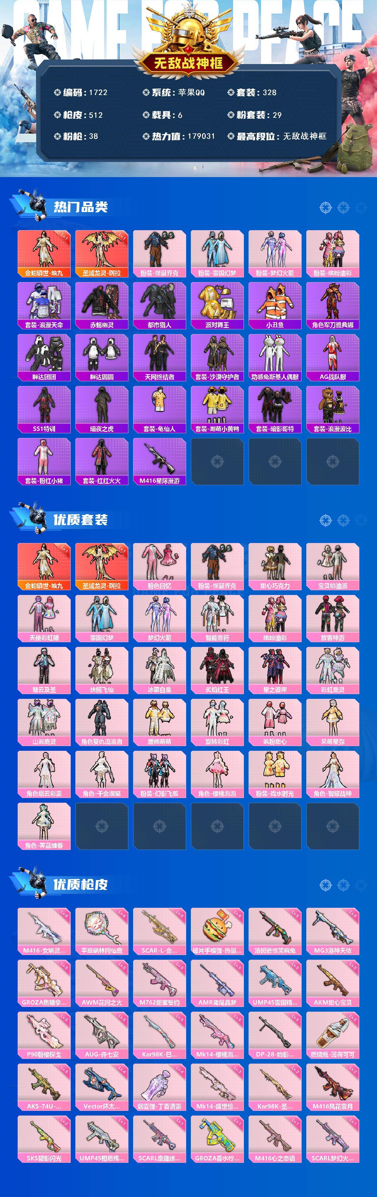[16858925]【1722】苹果 手Q-无敌战神框-2神装-29粉装-38特效枪-6载具-14粉色飞行器-179031热力值-28王牌印记-328套装-512枪皮 【红色神装等级】:圣域龙灵-瑞拉(一级),金蛇镇世-烛九(一级) 【红色角色神装】:圣域龙灵-瑞拉,金蛇镇世-烛九 【热门品类】:粉装-怪诞乔克,粉装-雪国幻梦,粉装-梦幻火箭,粉装-缤纷油彩,套装-浪漫天命,套装-赤蝎幽灵,套装-都市猎人,套装-派对舞王,套装-小丑鱼,角色-军刀雅典娜,套装-胖达团团,套装-胖达圆圆,套装-天网终结者,套装-沙漠守护者,套装-动感兔斯基人偶服,套装-AG战队服,套装-SS1特训,套装-暗夜之虎,套装-龟仙人,套装-潮萌小黄鸭,套装-暗影哥特,套装-浪漫波比,套装-粉红小猪,套装-红红火火,M416-星际漫游 【粉色套装】:粉装-粉色回忆,粉装-怪诞乔克,粉装-甜心巧克力,粉装-宝贝奶油派,粉装-天使彩虹糖,粉装-雪国幻梦,粉装-梦幻火箭,粉装-智能音符,粉装-缤纷油彩,粉装-放客神游,粉装-彗云及圣,粉装-扶摇飞仙,粉装-冰霜白皇,粉装-炙焰红王,粉装-星之彼岸,粉装-彩虹鹿灵,粉装-山涧鹿灵,角色-复仇流浪者,粉装-暖熊萌萌,粉装-旋转彩虹,粉装-飒粉甜心,角色-呆萌星弥,角色-烟云彩露,角色-千金淑猫,粉装-幻影飞狐,角色-樱桃泡泡,粉装-戏水时光,角色-智耀战神,角色-霁蓝缠春 【粉色枪皮等级】:AKM-甜心宝贝(五级),SCAR-L-梦幻火箭(一级),SCAR-L-童趣迷兔(一级),SCAR-L-金蛇镇世(六级),M416-心之恋语(一级),M416-风花雪月(二级),M416-暖熊萌萌(一级),M416-全功率超战(一级),M416-墨龙九天(一级),M416-女娲灵识(九级),GROZA-香水柠檬(一级),GROZA-焦糖拿铁(五级),AUG-超新星(一级),AUG-许七安(五级),M762-甜蜜誓约(五级),M762-鬼刀(一级),UMP45-雪国精灵(五级),UMP45-相思残雪(一级),Vector-环太平洋(四级),汤姆逊-怪笑疯兔(五级),AKS-74U-森灵之息(五级),P90-能量风暴(一级),P90-粉樱探戈(五级),Kar98K-巳巳如意(五级),Kar98K-圣域龙灵(三级),AWM-花间之火(五级),SKS-碧影闪光(二级),Mk14-盛世惊鸿(三级