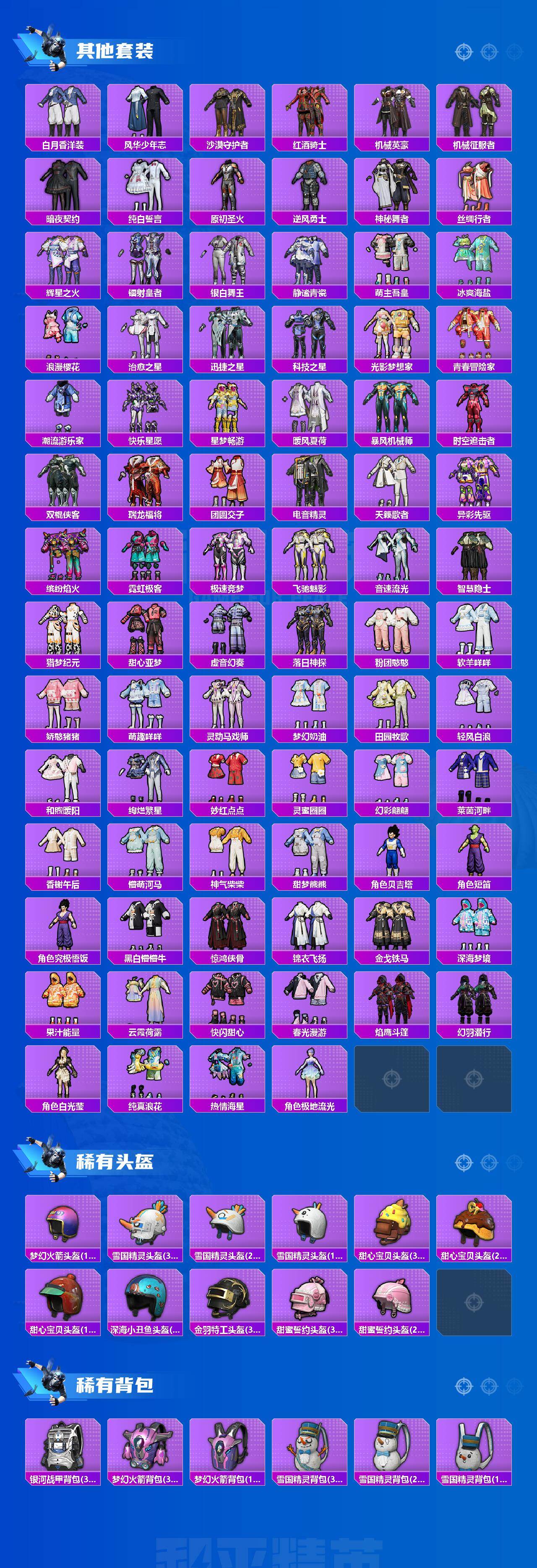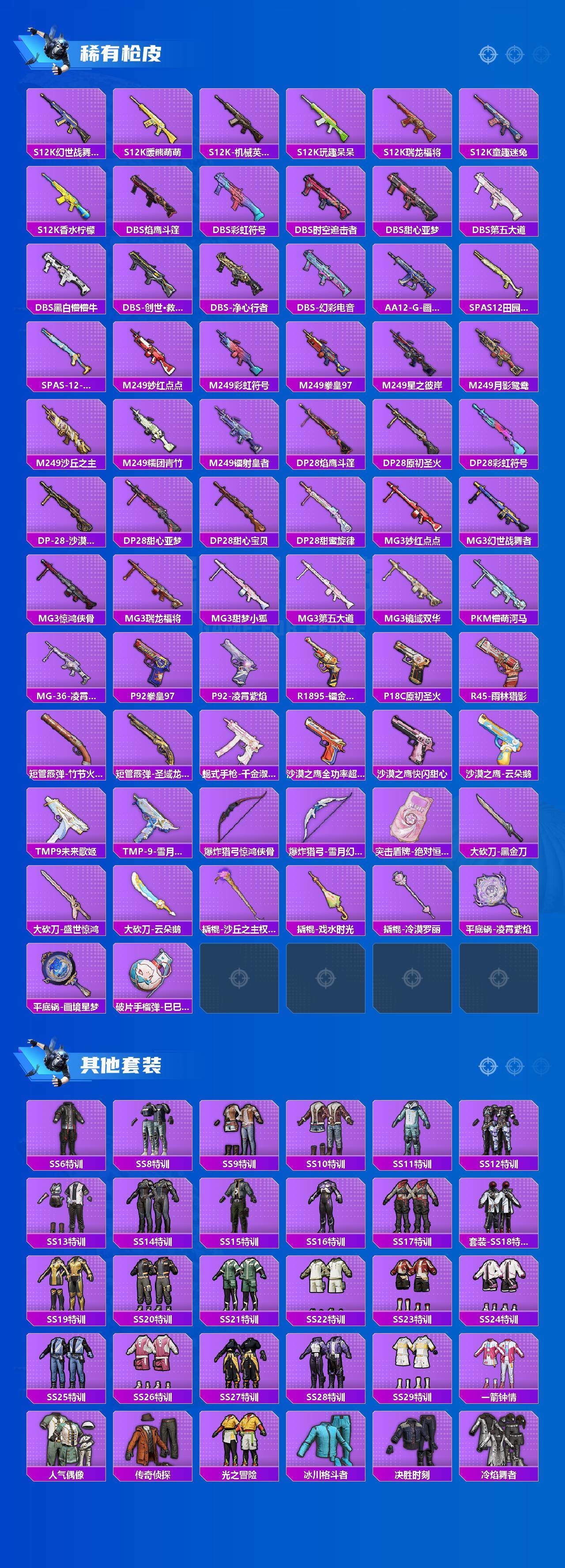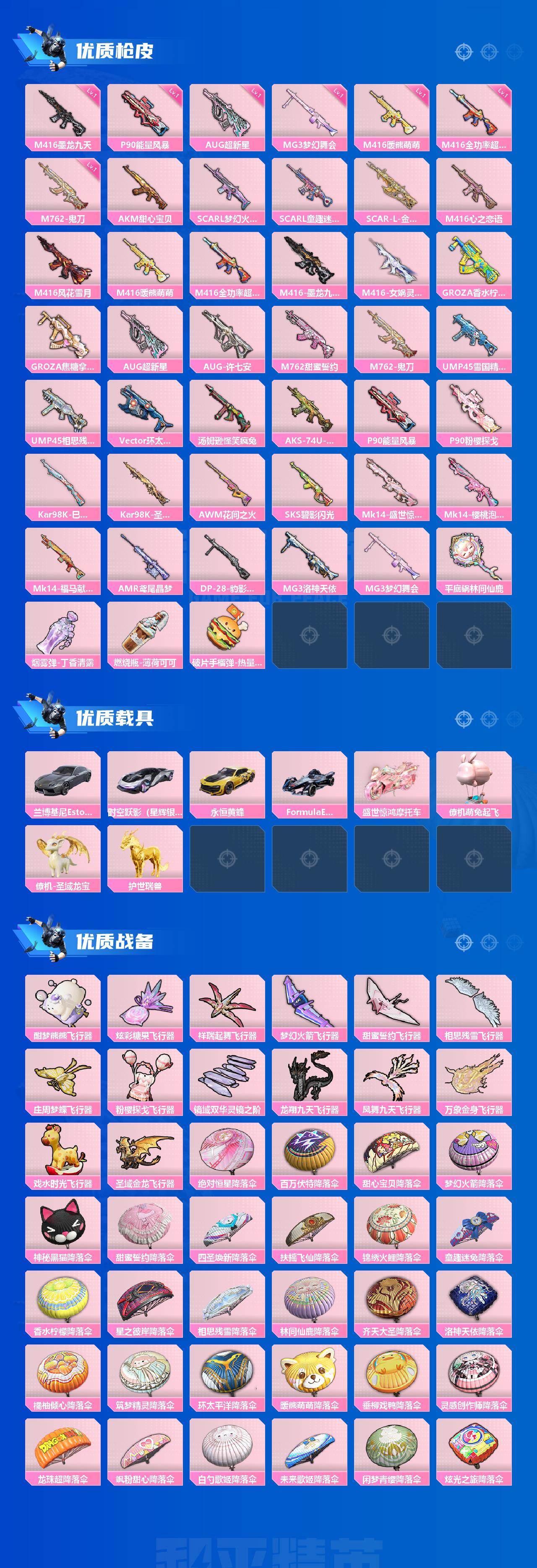 - [11516140]2粉装 2特效枪 3印记 可二次 可修改实名 女号 优质装备:AMR-智耀战神,星穹咏叹调,蜜獾-荧海星豚 热门装扮:朗月武圣 五级特效枪:五级AMR-智耀战神 二级特效枪:二级蜜獾-荧海星豚 紫色装扮:SS22特训,龙舌兰冰茶,妙红点点,幻彩翩翩,SS23特训,娇憨猪猪,萌趣咩咩,SS21特训,绚烂繁星,SS30特训套装,冰川特警,冷焰舞者,青涩时光,霓虹热舞,极速光影,SS20特训,SS31特训套装,云朵鹅,雪绒豹,SS33特训套装,顶瓜瓜,虚音幻奏,SS19特训,竞技角斗士,香草威化,甜心亚梦,SS18特训,坚韧舞者,长空猛禽,都市漫游者,酒红色名流,霓虹街区,青年教官,青涩年华,缤纷果语,耀眼新星,荣耀,蓝彩潮人,蓝色守护者,街头潮人,魅力单车,麻辣教官,黄色伏地魔,黄色名流,黄色运动,黎明保卫者,黑色伏地魔,绮丽涂鸦,极地朋克,极速红龙,柠萌假日,深蓝色名流,湖蓝色名流,幻世战舞者,完美偶像,帅气教官,幻影武者,探宝勇士,白色伏地魔,破晓战魂,破蛋小黄鸡,王牌教练,空岛之星,竞技达人朋克,红色运动,猛禽,灼焰舞者,牛气冲天,猎鹰,牛气满满,白光莹,SS28特训,玉兔迎春,竞技名士,惊鸿侠骨,SS25特训,SS24特训(SS24特训套装),锦衣飞扬,SS27特训,小丑鱼,SS26特训,大橘大利,小鸟芋圆,耀粉歌者,SS32特训服(SS32特训套装),青玉碎影,萌黄之夏,白糯汤圆,光之冒险,红剪之缘 优质战备:炙焰牛王降落伞,荧海星豚降落伞,彩虹甜喵降落伞,仲夏莫吉托降落伞