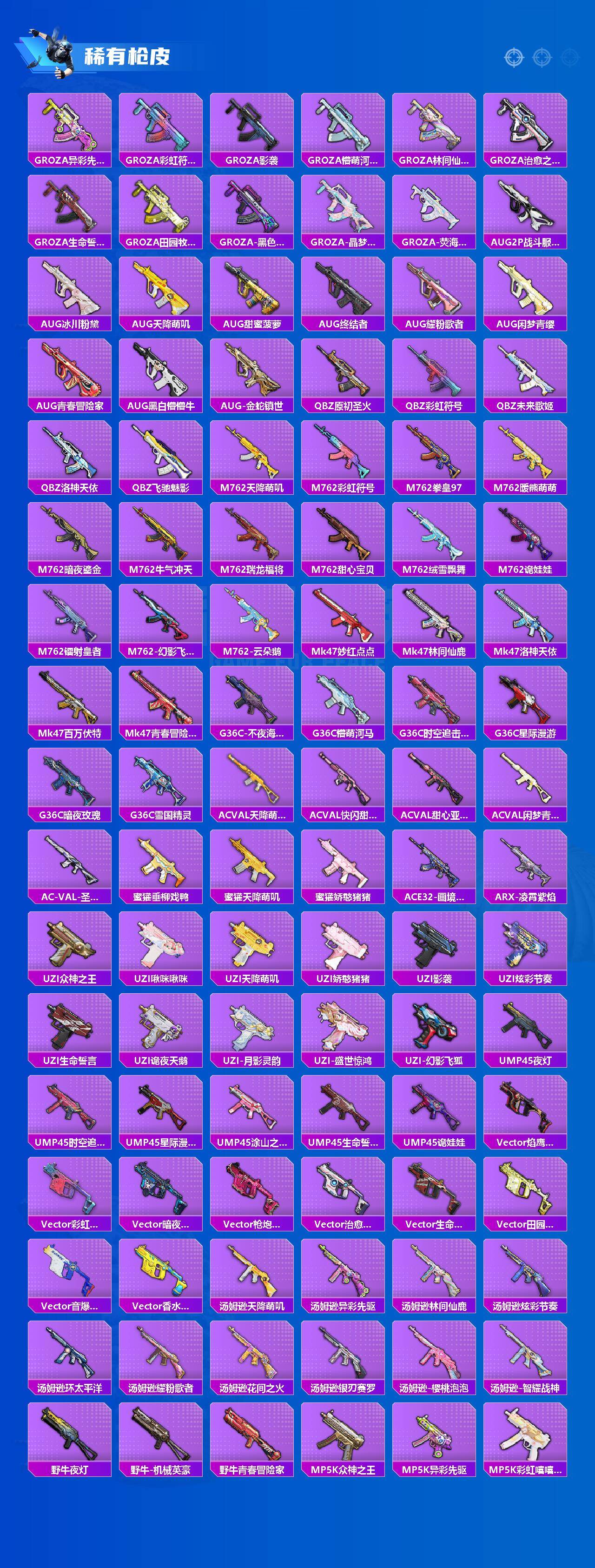 AKM-甜心宝贝,SCAR-L-梦幻火箭,SCAR-L-童趣迷兔,SCAR-L-金蛇镇世,M416-心之恋语,M416-风花雪月,M416-暖熊萌萌,M416-全功率超战,M416-墨龙九天,M416-女娲灵识,GROZA-香水柠檬,GROZA-焦糖拿铁,AUG-超新星,AUG-许七安,M762-甜蜜誓约,M762-鬼刀,UMP45-雪国精灵,UMP45-相思残雪,Vector-环太平洋,汤姆逊-怪笑疯兔,P90-能量风暴,P90-粉樱探戈,Kar98K-巳巳如意,Kar98K-圣域龙灵,AWM-花间之火,SKS-碧影闪光,Mk14-盛世惊鸿,Mk14-樱桃泡泡,AMR-鸢尾晶梦,MG3-洛神天依,MG3-梦幻舞会,平底锅-林间仙鹿,烟雾弹-丁香清露,破片手榴弹-热量炸弹