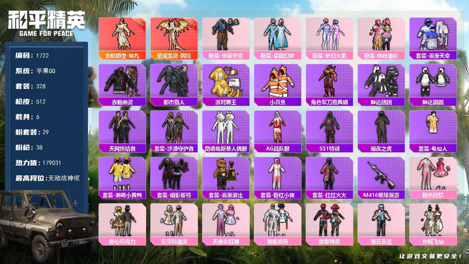 [16858925]【1722】苹果 手Q-无敌战神框-2神装-29粉装-38特效枪-6载具-14粉色飞行器-179031热力值-28王牌印记-328套装-512枪皮