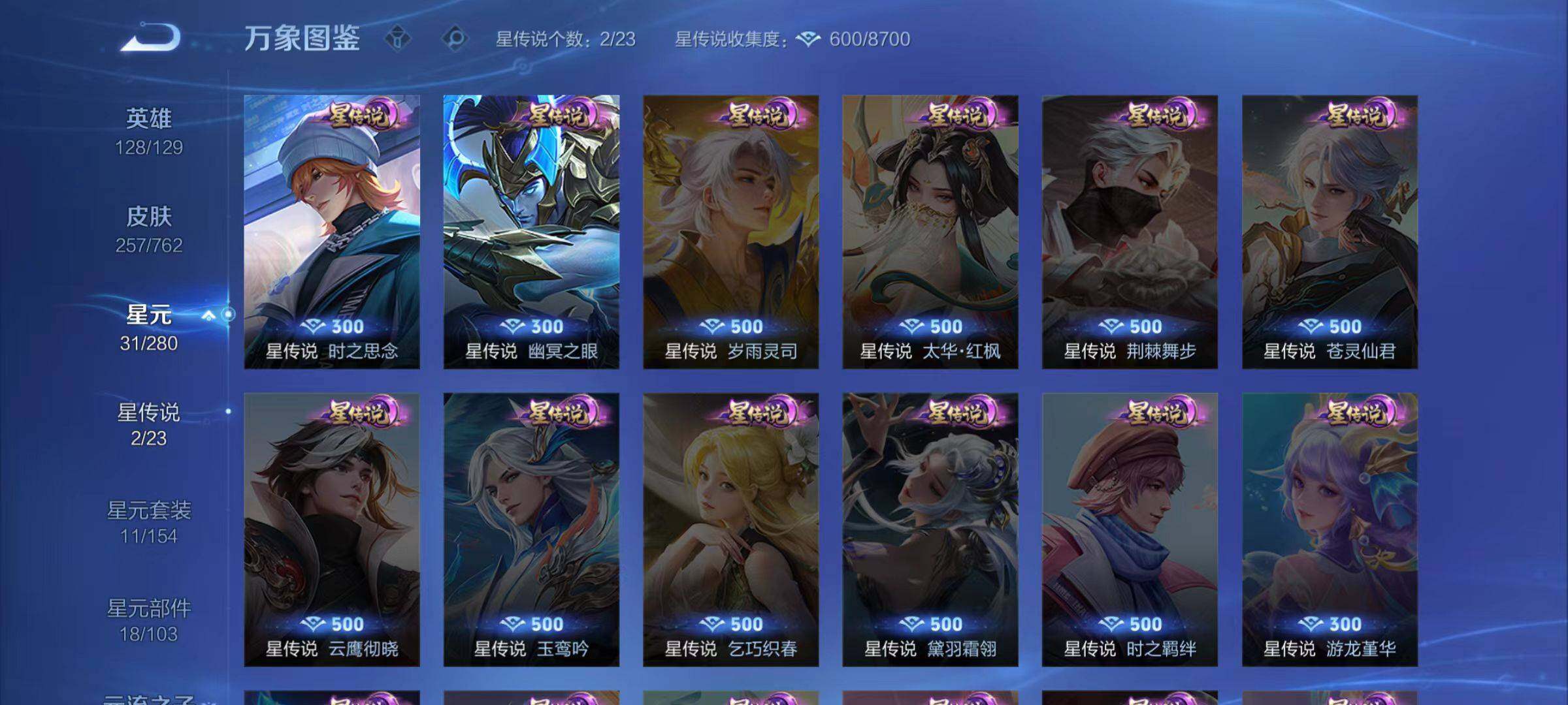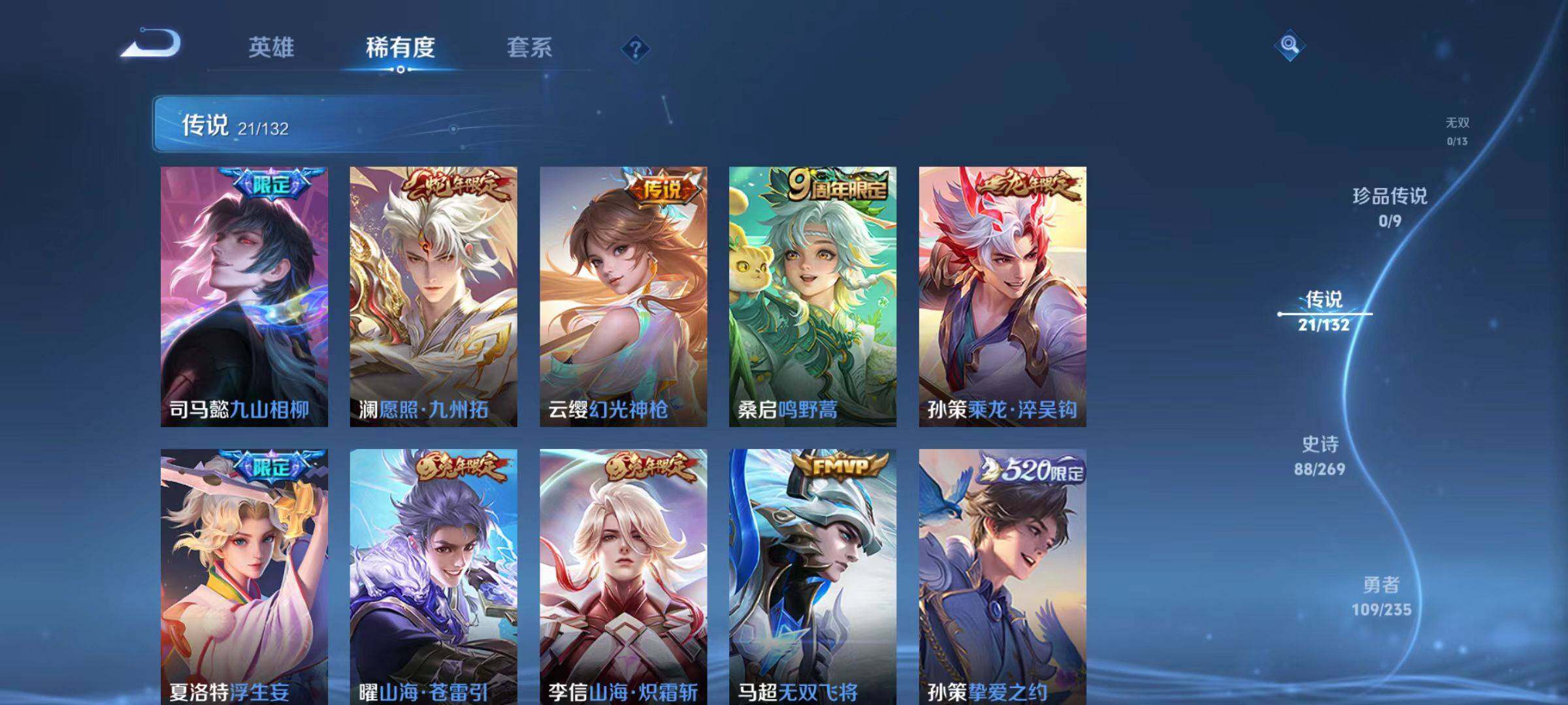 【传说皮肤】:司马懿九山相柳,澜愿照九州拓,云缨幻光神枪,桑启鸣野蒿,孙策乘龙淬吴钩,夏洛特浮生妄,曜山海苍雷引,李信山海炽霜斩,马超无双飞将,孙策挚爱之约,孙策末日机甲,曜李逍遥 ,铠绛天战甲,镜炽阳神光,虞姬启明星使,曜云鹰飞将,李信一念神魔,刘备时之恋人,张良黄金白羊座,达摩黄金狮子座,宫本武藏地狱之眼