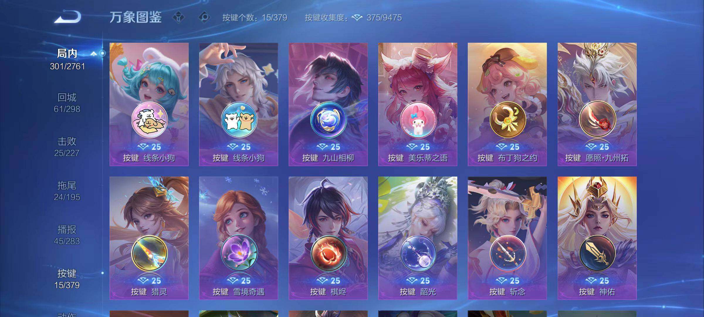 小乔青蛇,大乔白蛇,瑶遇见神鹿,娜可露露晚萤,伽罗箭羽风息,李元芳逐浪之夏,不知火舞魅语,大乔猫狗日记,孙策猫狗日记,阿轲节奏热浪,露娜紫霞仙子,诸葛亮黄金分割率,王昭君偶像歌手,雅典娜冰冠公主,吕布末日机甲,橘右京修罗,墨子龙骑士,刘禅天才门将,白起星夜王子,安琪拉心灵骇客,程咬金功夫厨神,刘邦德古拉伯爵,兰陵王暗隐猎兽者,曹操幽灵船长,宫本武藏鬼剑武藏,亚瑟心灵战警,蔡文姬舞动绿茵,小乔缤纷独角兽,夏侯惇乘风破浪,花木兰水晶猎龙者,铠曙光守护者,百里玄策热力回旋,墨子金属风暴,百里玄策原初追逐者,吕布圣诞狂欢,貂蝉圣诞恋歌,百里守约特工魅影,嬴政暗夜贵公子,嫦娥拒霜思,雅典娜黎明之约,李白千年之狐,哪吒雪上飞焰,夏洛特永昼,澜赏金猎手,杨玉环银翎春语,刘备百相守梦,刘禅电玩·爆裂旋风,蒙犽百解令