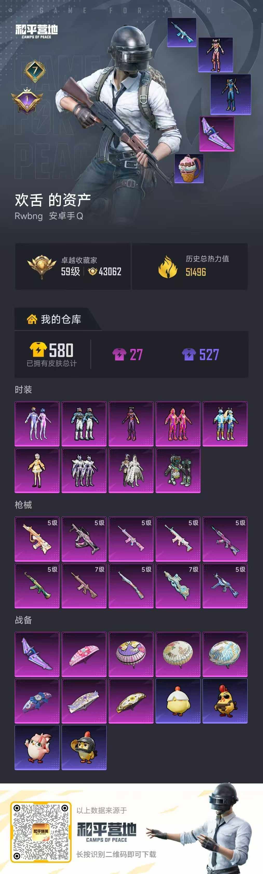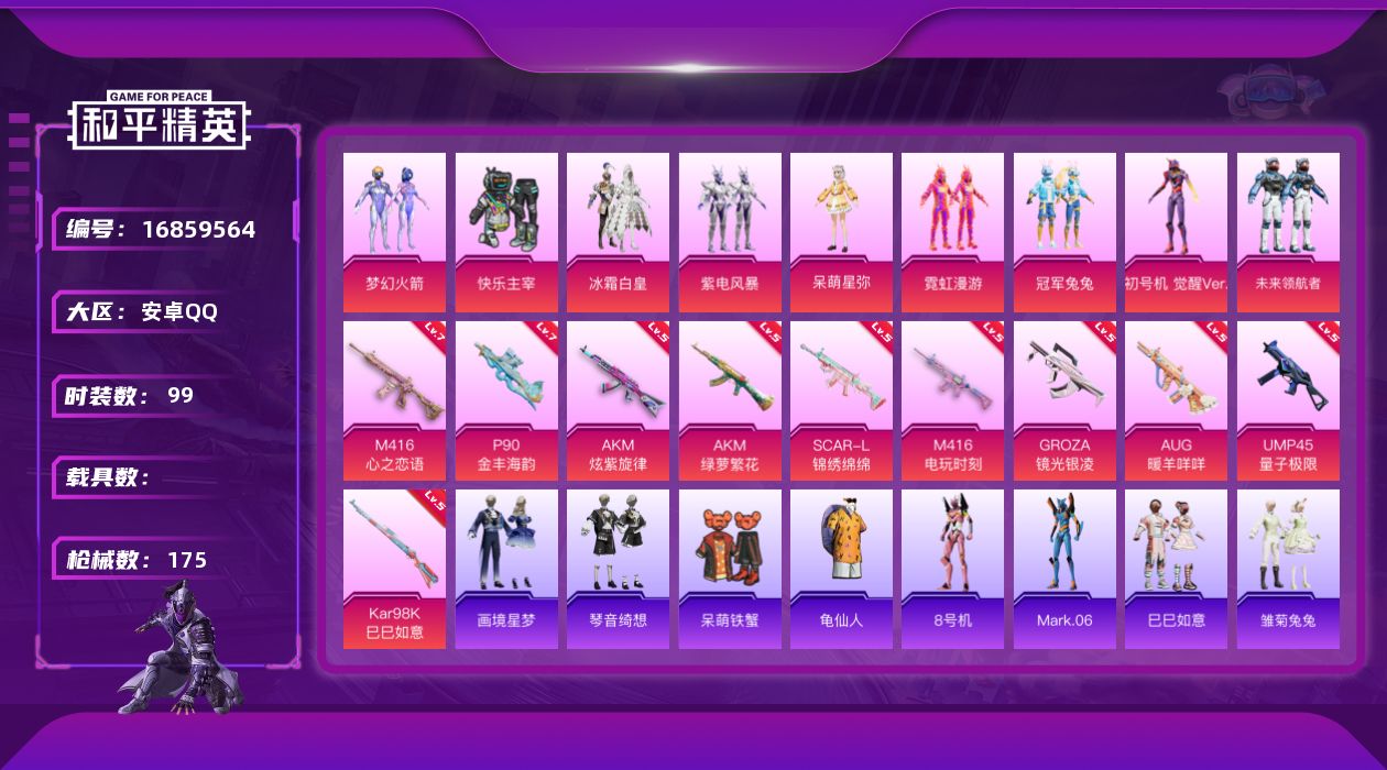 - [13101564]安卓 手Q-10粉装-8特效枪-2载具-2粉色飞行器-36132热力值-2王牌印记-70套装-89枪皮 【热门品类】:套装-龟仙人 【粉色载具】:迈凯伦570S(旭日黄),Formula E Gen2(幽光蓝) 【粉色套装】:角色-洛天依,粉装-赤焰黑爵,粉装-紫电风暴,粉装-圣光天使,粉装-霞光圣骑,粉装-寒光使者,粉装-第五大道,粉装-纯珍童话,粉装-天星战神,粉装-未来歌姬 【粉色枪皮等级】:SCAR-L-纯梦嫁纱(四级),GROZA-焦糖拿铁(四级),Vector-飒粉甜心(四级),P90-仙履奇缘(四级),M417-第五大道(四级),MG3-梦幻舞会(四级),PKM-天星战神(四级),爆炸猎弓-雪梅暗香(三级) 【粉色枪皮】:SCAR-L-纯梦嫁纱,GROZA-焦糖拿铁,Vector-飒粉甜心,P90-仙履奇缘,M417-第五大道,MG3-梦幻舞会,PKM-天星战神,爆炸猎弓-雪梅暗香 【粉色飞行器】:纯梦嫁纱飞行翼,黄族统领飞行器 【粉色降落伞】:梦幻火箭降落伞,激战未来降落伞,冷魅冰骑降落伞,圣光天使降落伞,音爆索尼克降落伞,第五大道降落伞,雪梅暗香降落伞,纯梦嫁纱降落伞,龙珠超降落伞,梦幻舞会降落伞,飒粉甜心降落伞,黄族统领降落伞,天星战神降落伞,璀璨巨星降落伞,未来歌姬降落伞,变形金刚降落伞 【稀有套装】:套装-龟仙人 【稀有枪皮】:AKM-彩虹符号,AKM-星兔领航员,M16A4-蓝色火焰,SCAR-L-甜蜜誓约,SCAR-L-红色方程式,SCAR-L-银碳小老虎,M416-彩虹嘻嘻猴,M416-糯团青竹,GROZA-懵萌河马,AUG-圣光天使,AUG-天降萌叽,QBZ-未来歌姬,QBZ-银碳小老虎,M762-天星战神,M762-天降萌叽,M762-第五大道,Mk47-妙红点点,G36C-懵萌河马,UZI-诡夜天鹅,UMP45-仲夏莫吉托,UMP45-涂山之恋,Vector-音爆索尼克,汤姆逊-暗夜鎏金,野牛-天星战神,MP5K-彩虹嘻嘻猴,MP5K-飒粉甜心,Kar98K-梦幻火箭,AWM-胡桃卫兵,AWM-飒粉甜心,SKS-未来歌姬,VSS-彩虹符号,VSS-绿野极光,Mini14-彩虹嘻嘻猴,Mini14-梦幻火箭,Mini14-涂山之恋,Mini14-甜心娃娃,Mk14-纯梦嫁纱,Win94-畅跳缤纷,QBU-全功率超战,QBU-飒粉甜