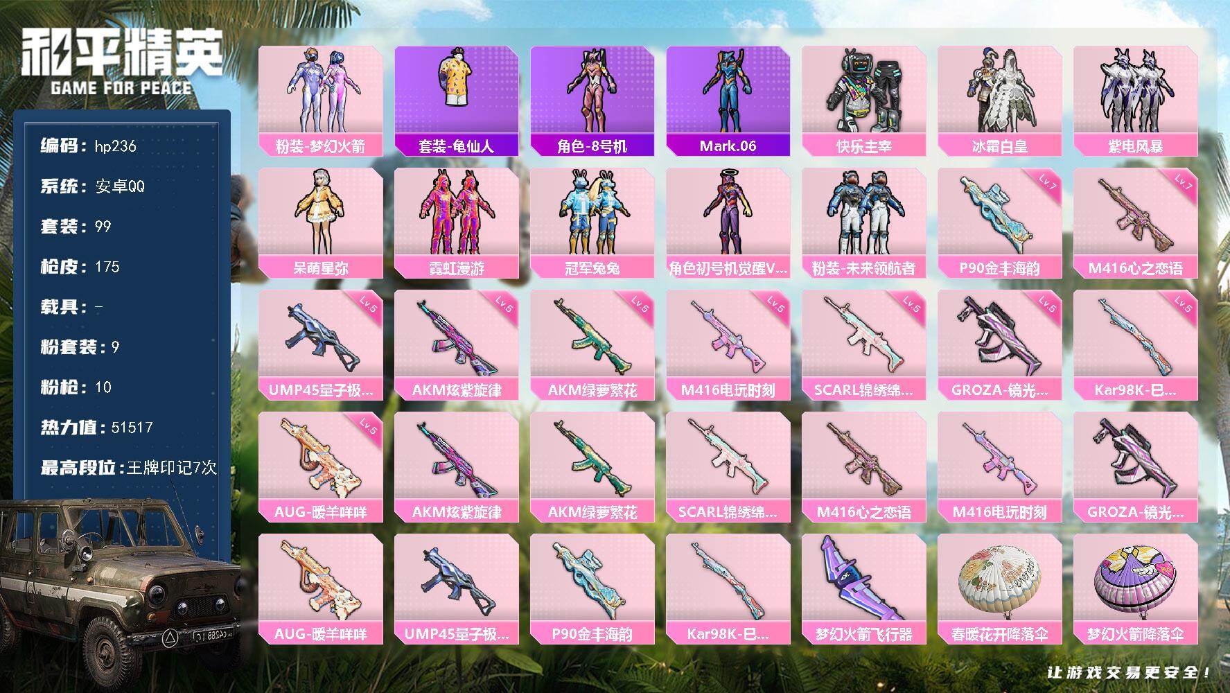 [16859564]安卓 手Q-9粉装-10特效枪-0载具-1粉色飞行器-51517热力值-7王牌印记-99套装-175枪皮