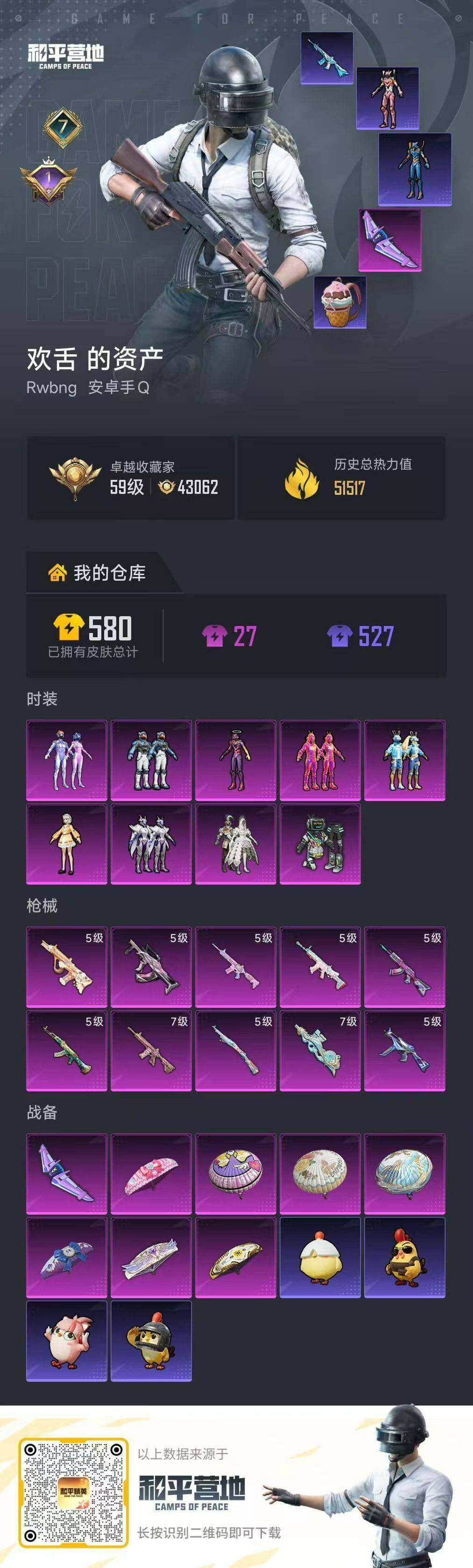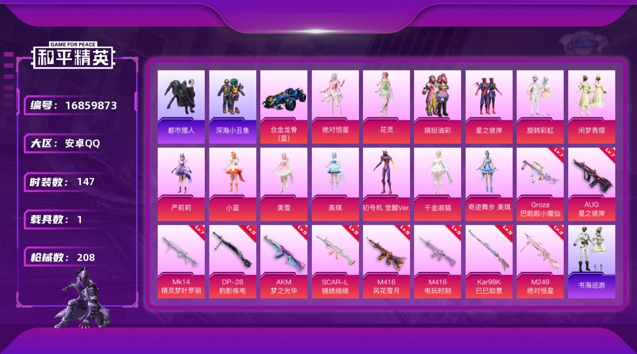[16859873]安卓 手Q-13粉装-10特效枪-1载具-5粉色飞行器-67119热力值-10王牌印记-147套装-208枪皮