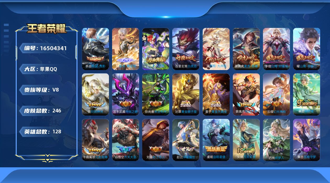 - [12950620]苹果Q-V8-尊贵铂金I段位-124英雄-186皮肤-1典藏-1珍品传说-5传说-51史诗 【荣耀典藏】:诸葛亮星域神启 【珍品传说】:马可波罗怪盗基德 【传说皮肤】:曜山海苍雷引,孙尚香音你闪耀,虞姬启明星使,后羿黄金射手座,孙悟空地狱火 【限定皮肤】:蒙犽顽岩魄,杨戬破阵退雄兵,狄仁杰阴阳师,赵云皇家上将,嬴政白昼王子,芈月重明,吕布猎兽之王,夏侯惇朔风刀,甄姬游园惊梦,曹操烛龙,典韦穷奇,马可波罗山海玄木吟,狄仁杰魔术师,项羽海滩派对,老夫子醍醐杖,关羽冰锋战神,貂蝉逐梦之音,韩信飞衡,花木兰青春决赛季,花木兰瑞麟志,孙悟空至尊宝,孙悟空大圣娶亲,牛魔御旌,虞姬启明星使,钟馗驱傩正仪,杨玉环遇见飞天,百里守约朱雀志,弈星混沌棋,明世隐疑决卦,裴擒虎擒涛扼浪,狂铁御狮,米莱狄御霄,云中君纤云弄巧,盾山御銮,嫦娥暖冬兔眠,曜山海苍雷引,鲁班大师探海日志,桑启海盐诗旅,暃星界游侠,艾琳女武神,张良古海寻踪,鬼谷子天穹祈灯,刘邦剑破天穹,程咬金群星魔术团,周瑜熔金海岸 【年限皮肤】:百里守约朱雀志,花木兰瑞麟志,韩信飞衡,马超神威,马可波罗山海玄木吟,曜山海苍雷引 【赛季限定】:芈月重明,夏侯惇朔风刀,曹操烛龙,典韦穷奇,老夫子醍醐杖,张良古海寻踪,牛魔御旌,钟馗驱傩正仪,弈星混沌棋,明世隐疑决卦,裴擒虎擒涛扼浪,狂铁御狮,米莱狄御霄,盾山御銮,鲁班大师探海日志,桑启海盐诗旅,鬼谷子天穹祈灯,刘邦剑破天穹 【战令限定】:嬴政白昼王子,吕布猎兽之王,嫦娥暖冬兔眠,暃星界游侠 【史诗皮肤】:露娜紫霞仙子,赵云皇家上将,赵云未来纪元,貂蝉圣诞恋歌,王昭君偶像歌手,狄仁杰魔术师,宫本武藏鬼剑武藏,孙尚香水果甜心,嬴政摇滚巨星,墨子金属风暴,吕布圣诞狂欢,曹操幽灵船长,李白千年之狐,张飞乱世虎臣,韩信白龙吟,关羽冰锋战神,貂蝉逐梦之音,孙悟空至尊宝,花木兰水晶猎龙者,夏侯惇乘风破浪,兰陵王暗隐猎兽者,诸葛亮黄金分割率,甄姬游园惊梦,雅典娜冰冠公主,花木兰青春决赛季,百里守约特工魅影,铠曙光守护者,李元芳逐浪之夏,白起星夜王子,杨玉环遇见飞天,嬴政白昼王子,孙策猫狗日记,大乔猫狗日记,百里守约朱雀志,孙悟空大圣娶亲,花木兰瑞麟志,伽罗箭羽风息,狄仁杰鹰眼统帅,公孙离无限星赏官,娜可露露晚萤,韩信飞衡,马超神威,云中君纤云弄巧,百里玄策热力回旋,杨戬天秀启明,暃星界游侠,马可波罗