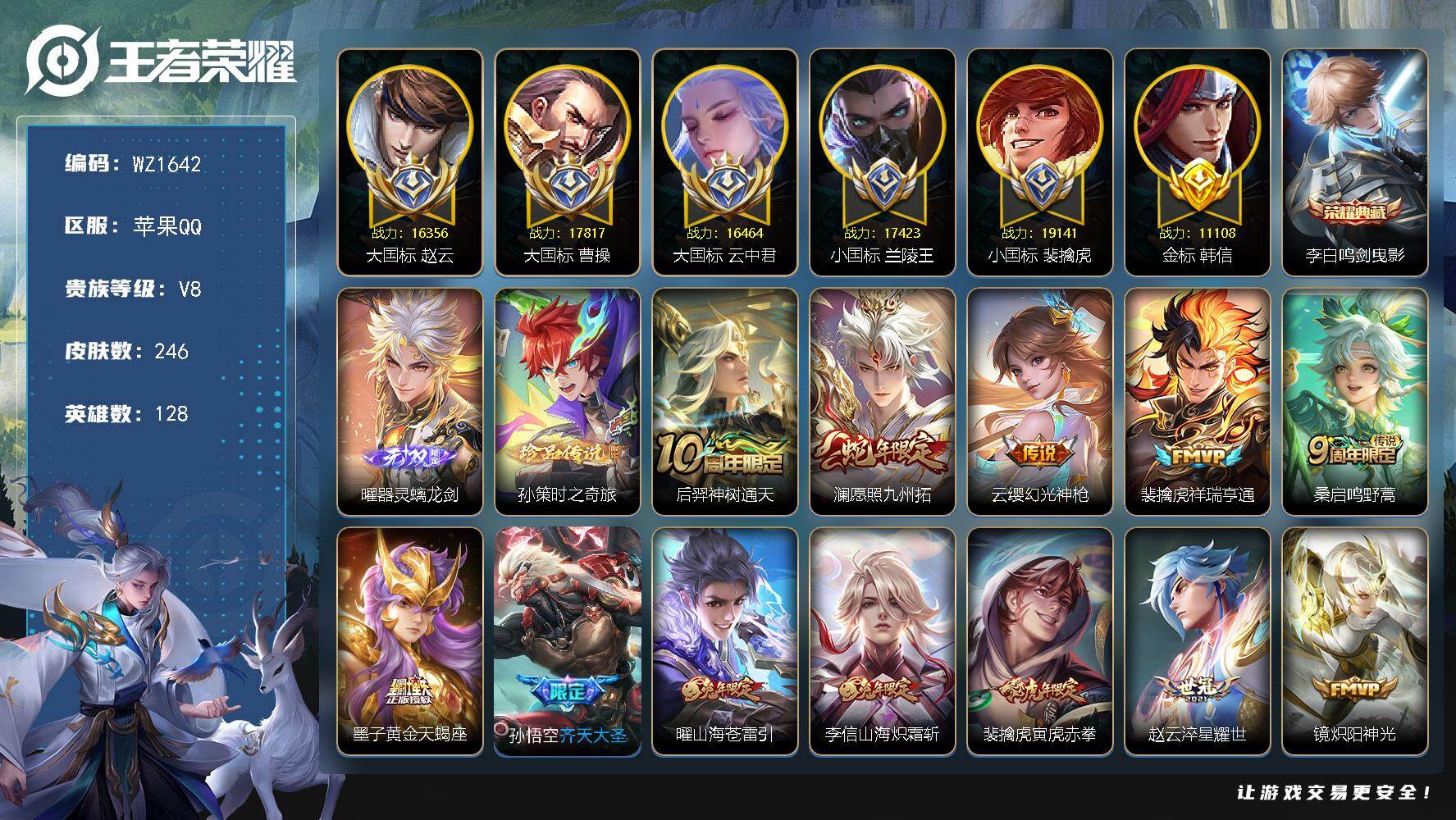 [16504341]野王号,百段打野,三大国,大国曹操,大国云中君,大国赵云,6小国,数字小国1兰陵王,数字国2老虎,小国玄策,李白,凯,刘备,万战韩信-苹果Q-V8-永恒钻石I段位-128英雄-246皮肤-1典藏皮肤-1无双-1珍品传说-19传说-58史诗,李白典藏,无双曜器灵螭龙剑,珍品孙策时之奇旅