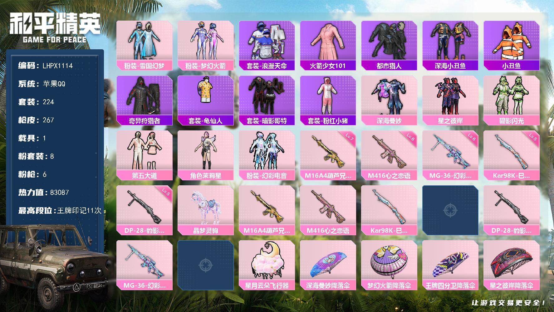 [16861596]老101【特价出售/店主推荐】苹果 手Q-8粉装-6特效枪-1载具-3粉色飞行器-83087热力值-11王牌印记-224套装-267枪皮 【热门品类】:粉装-雪国幻梦,粉装-梦幻火箭,套装-浪漫天命,套装-火箭少女101,套装-都市猎人,套装-深海小丑鱼,套装-小丑鱼,套装-奇异狩猎者,套装-龟仙人,套装-暗影哥特,套装-粉红小猪 【粉色套装】:粉装-深海曼妙,粉装-雪国幻梦,粉装-梦幻火箭,粉装-星之彼岸,粉装-碧影闪光,粉装-第五大道,角色-茉莉星,粉装-幻彩电音 【粉色枪皮等级】:M16A4-葫芦兄弟(七级),M416-心之恋语(六级),Kar98K-巳巳如意(五级),DP-28-豹影疾电(五级),MG-36-幻彩电音(六级) 【粉色载具】:晶梦灵驹 【粉色枪皮】:M16A4-葫芦兄弟,M416-心之恋语,Kar98K-巳巳如意,Mk14-福马献瑞,DP-28-豹影疾电,MG-36-幻彩电音 【粉色飞行器】:炫彩糖果飞行器,星月云朵飞行器 【粉色降落伞】:深海曼妙降落伞,梦幻火箭降落伞,王牌四分卫降落伞,星之彼岸降落伞,烈焰拳霸降落伞,流星咚咚降落伞,天之羽翼降落伞,碧影闪光降落伞,第五大道降落伞,千金淑猫降落伞,晶梦幻蝶降落伞,星穹咏叹调降落伞,幻彩电音降落伞,冷漠罗丽降落伞,炫彩糖果降落伞,暮色玫影降落伞 【稀有套装】:套装-龟仙人,套装-圣穹绘梦,套装-炫彩糖果,套装-糖糖葫芦,套装-青团波波,角色-摩登魅猫,套装-鱼渊荷华,套装-晶辉守护,角色-蜜桃派对,套装-紫幽梦,套装-蓝冰羽,套装-极速光影,套装-彩虹兔,套装-云朵鹅,套装-雪绒豹,角色-灵公主,套装-朱霞炽焰,套装-凌霄紫焰,套装-擎苍青焰,角色-紫俏灵猫,套装-书海巡游,套装-画境星梦,套装-琴音绮想,套装-雨过天青,套装-红釉青花 【稀有枪皮】:AUG-冰晶雪宝,AKM-夜灯,AKM-奇异狩猎者,AKM-彩虹符号,AKM-影袭,AKM-恐龙拽拽,AKM-星之彼岸,AKM-灼热熔岩,AKM-破晓战魂,AKM-缤纷海域,AKM-萌趣颜团子,AKM-虎虎生威,AKM-霓虹街区,AKM-龙的传人,AKM-灵猫魔法师,M16A4-幻世战舞者,M16A4-甜心亚梦,M16A4-蓝色火焰,SCAR-L-夜灯,SCAR-L-暗夜玫瑰,SCAR-L-炫彩节奏,SCAR-L-玉兔迎春,SCAR-L-红色方程