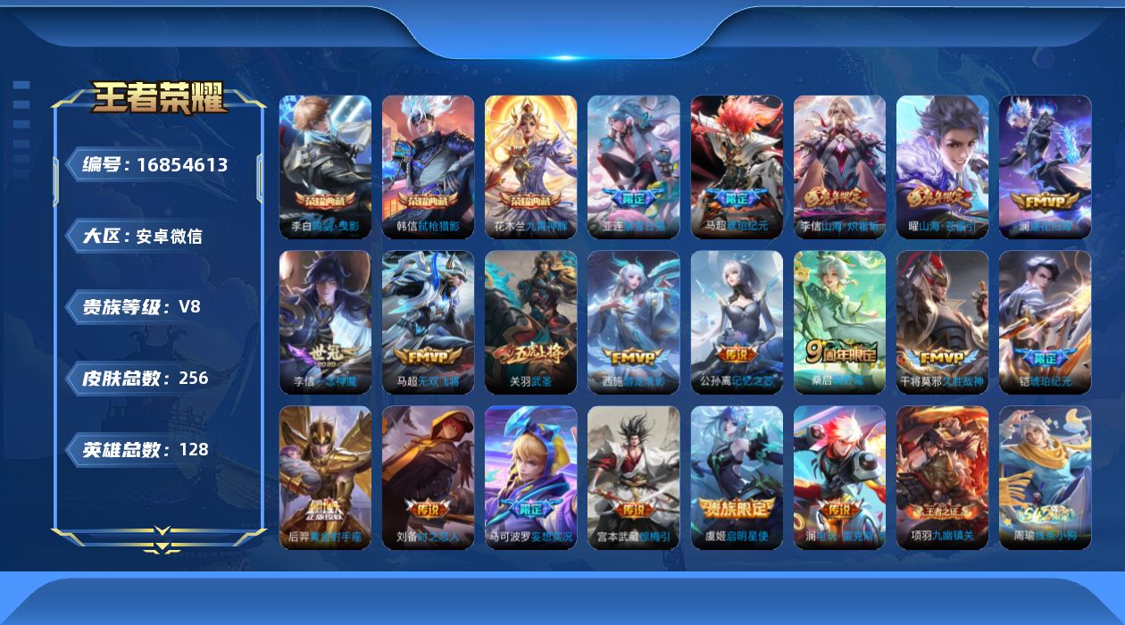 [16854613]安卓WX-V8-永恒钻石I段位-128英雄-256皮肤-3典藏皮肤-19传说-79史诗
