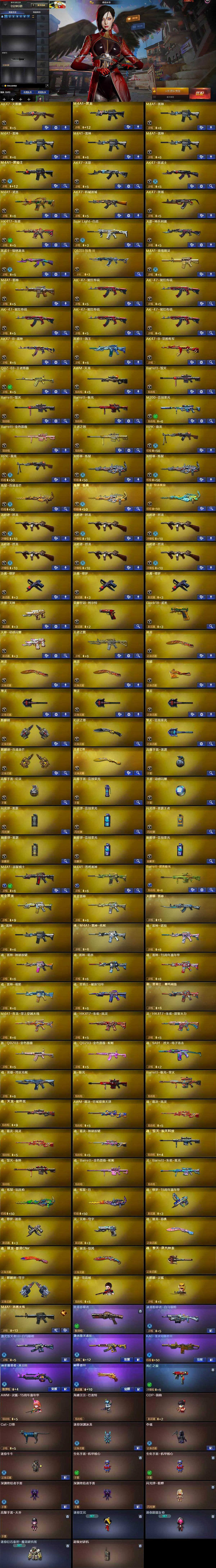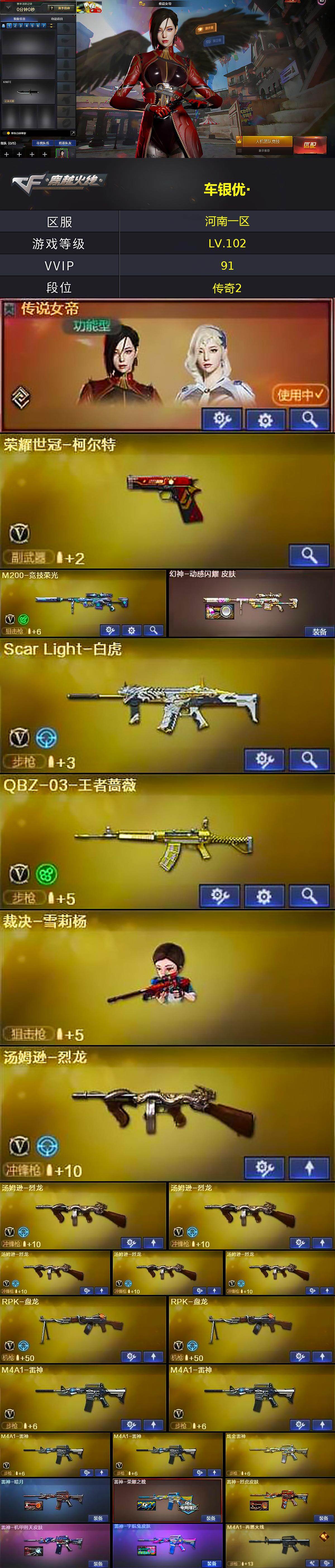 【热门武器】:Scar Light-白虎,HK417-朱雀,M200-竞技荣光,死亡之眼,荣耀世冠-柯尔特,金色小号,Cat-刀锋,M4A1-黑骑士,汤姆逊-烈龙*6,RPK-盘龙*2,加特林-炼狱*2,裁决-雪莉杨,沙鹰-修罗*3