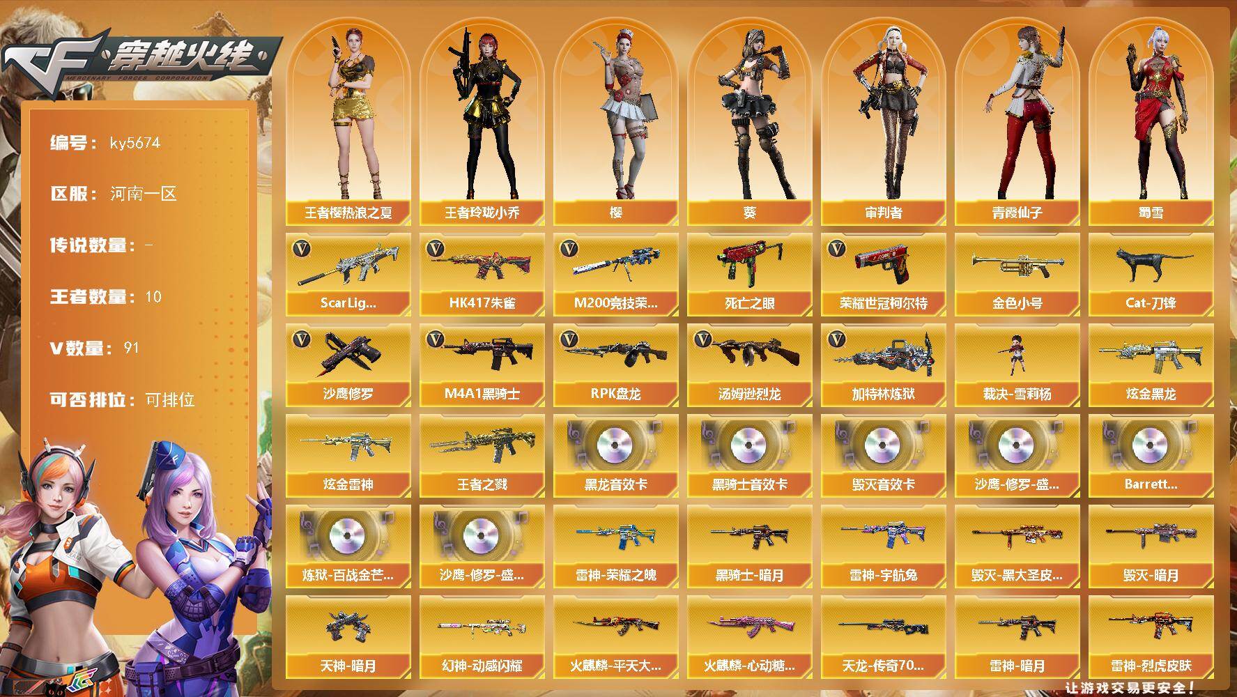- [16665530]河南一区-64V-3王者-3炫金 【热门武器】:QBZ03-金色蔷薇,柯尔特-荣耀世冠白鲨2023*2,M200-竞技荣光,死亡之眼,C.A.T,M4A1-黑骑士*2,汤姆逊-烈龙*3,COP-白鲨,沙鹰-修罗*4 【王者炫金武器】:王者之幻,炫金黑龙,炫金武士,炫金毁灭 【音效卡】:M4A1-黑骑士音效卡,Barrett-毁灭音效卡,Barrett-碧霄极光音效卡,炼狱-百战金芒-庆典舞曲音效卡,死神-雪域霜狐-怀旧音效卡 【皮肤】:金色蔷薇-破浪逐光 皮肤,裁决-羽掣 皮肤,雷神-暗月,雷神-荣耀之魄,M4A1-再燃火线,火麒麟-轻羽皮肤,火麒麟-心动糖果,毁灭-暗月,毁灭-星空,毁灭-英雄计划 皮肤,战神-粉色甜心皮肤,战神-紫绶金章皮肤,战神-流金岁月皮肤,天龙-秘银,天龙-能量核心,屠龙-春桃 皮肤,屠龙-破浪逐光 皮肤*2,轻型军用手斧-再燃火线,擎天-秘银 【角色】:葵,电竞教官-云悠悠,战地猎狐,雪域霜狐,奇洋探员,乔伊教练,修道士,云海玲珑,暗夜-X,初恋灵狐,芳心审判者,飞虎队-X,娟娟,兰-新年限定,兰妹妹,灵狐者-X,灵狐者-黄金海岸,龙儿,曼陀罗-X,潘多拉-X,潜龙队-X,青霞仙子,斯沃特-X,兔囡囡,雪莉杨,影武者-X,游珑儿,职业选手 【人偶武器】:COP-白鲨,天龙-曼陀罗,M4A1-雷神-精英刀锋,加特林-机械猎手,C.A.T,迷你深渊冰龙,闪光弹-小乔 【暴走生化】:死亡之眼 【挑战大师】:冰龙粉碎者-白马银枪,激光毁灭者III,神圣爆裂者-末日III 【英雄级武器】:AK47-火麒麟,M4A1-黑龙,M4A1-雷神,M4A1-黑骑士*2,AK12-天启,无影-神兵利器,黑武士-锦绣游龙,死神-雪域霜狐,QBZ03-独角-IV,M4A1-玫瑰精灵,QBZ03-金色蔷薇,AK-47-猩红传说*4,AK47-B-战神,AWM-天龙,Barrett-毁灭,AWM-裁决,M200-竞技荣光,王者之怒-觉醒版,炼狱-百战金芒,汤姆逊-烈龙*3,AA-12-雷霆,沙鹰-修罗*4,沙鹰-天神,COP-雷霆,柯尔特-荣耀世冠白鲨2023*2,柯尔特-竞技荣光,屠龙*4,擎天,麒麟刺-百战金芒,高爆手雷-雷霆,高爆手雷-竞技荣光,闪光弹-雷霆,闪光弹-竞技荣光*4,闪光弹-云龙,烟雾弹-雷霆,烟雾弹-竞技荣光,M4A1-赤狱骑士,Barrett