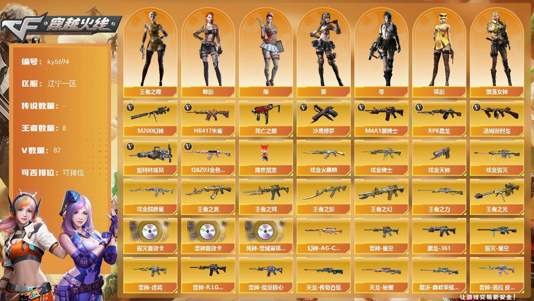 [16767739]辽宁一区-83V-8王者武器数-6炫金武器数 【热门武器】:QBZ03-金色蔷薇,HK417-朱雀,M200-幻神,死亡之眼*2,M4A1-黑骑士,汤姆逊-烈龙*3,RPK-盘龙*2,加特林-炼狱,降世魔童,沙鹰-修罗*5 【王者炫金武器】:王者之戮,王者之幻,王者之翼,王者之影,王者之光,王者之力,炫金火麒麟,炫金骑士,炫金超新星,炫金毁灭,炫金天神*2 【音效卡】:M4A1-雷神音效卡,Barrett-毁灭音效卡,死神-雪域霜狐-怀旧音效卡 【皮肤】:幻神-AG-CFPL S24冠军 皮肤,裁决-巅峰荣耀 皮肤,雷神-能量核心*2,雷神-星空,雷神-虎将,雷神-R.LGD-CFPLS18冠军,雷神-诺拉 皮肤,火麒麟-雷神,毁灭-星空,M4A1-黑龙-361,天龙-秘银,AWM-天龙-传奇白鲨,龙啸-巅峰荣耀 皮肤 【角色】:零,葵,樱,魅影,王者之瞳,堕落女神,狐影,雪域霜狐,暗夜-X,风暴女,疾风,兰-海滩派对,零-水下丽影,麻雀,青霞仙子,影武者-X 【人偶武器】:COP-旗袍,迷你深渊冰龙,迷你生化手雷,降世魔童 【暴走生化】:死亡之眼*2 【挑战大师】:AK47-冰龙粉碎者,激光毁灭者III,KAC-圣炎切割者III,神圣爆裂者-末日III 【英雄级武器】:M4A1-千变,AK47-火麒麟*3,M4A1-黑龙*3,M4A1-雷神*3,M4A1-黑骑士,AK47-无影,M4A1-死神*5,AK47-黑武士,AN94-超新星,HK417-朱雀,死神-雪域霜狐,M4A1-玫瑰精灵,QBZ03-金色蔷薇,王者之心-觉醒版,AWM-天龙,Barrett-毁灭*4,Barrett-极光*2,AWM-裁决,M200-幻神,Barrett-朱雀,Barrett-电竞装甲,Barrett-金色蔷薇,RPK-盘龙*2,加特林-炼狱,汤姆逊-烈龙*3,沙鹰-修罗*5,沙鹰-天神*2,柯尔特-电竞装甲,屠龙*4,龙啸,擎天,麒麟刺,尼泊尔-电竞装甲,王者之啸-觉醒版,高爆手雷-雷霆,闪光弹-雷霆,烟雾弹-雷霆,M4A1-赤狱骑士 【道具】:奇洋探员-海龟背包,炫彩背包,背包-洛丽塔,雪域霜狐炫彩背包,救世主-黑桃战神,妩媚妖姬,绿色巨人,灵魂忍者,变异宝贝,迷雾幽灵,夺命之镰,防化服*2,流光-再燃火线,语音特效-怀旧,雪域霜狐表情,防弹头盔*3,防弹衣*2,C4工具钳*2