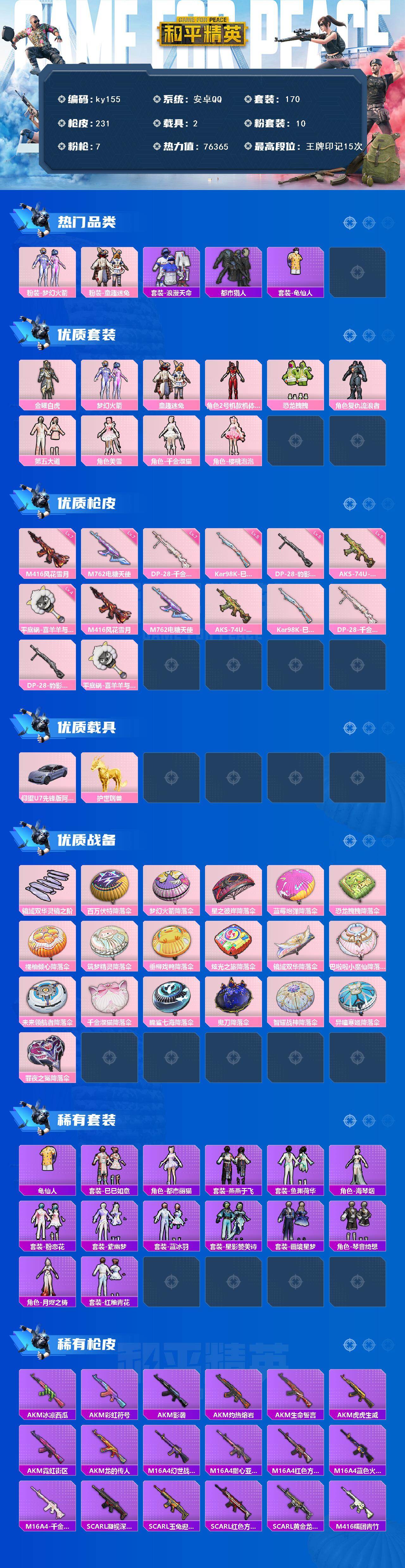 [16871361]安卓 手Q-10粉装-7特效枪-2载具-1粉色飞行器-76365热力值-15王牌印记-170套装-231枪皮 【热门品类】:粉装-梦幻火箭,粉装-童趣迷兔,套装-浪漫天命,套装-都市猎人,套装-龟仙人 【粉色套装】:粉装-金曜白虎,粉装-梦幻火箭,粉装-童趣迷兔,角色-2号机款机体服,粉装-恐龙拽拽,角色-复仇流浪者,粉装-第五大道,角色-美雪,角色-千金淑猫,角色-樱桃泡泡 【粉色枪皮等级】:M416-风花雪月(七级),M762-电糖天使(七级),AKS-74U-森灵之息(五级),Kar98K-巳巳如意(五级),DP-28-千金淑猫(七级),DP-28-豹影疾电(五级),平底锅-喜羊羊与灰太狼(四级) 【粉色载具】:仰望U7(阿盖尔紫),护世瑞兽 【粉色枪皮】:M416-风花雪月,M762-电糖天使,AKS-74U-森灵之息,Kar98K-巳巳如意,DP-28-千金淑猫,DP-28-豹影疾电,平底锅-喜羊羊与灰太狼 【粉色飞行器】:镜域双华-灵镜之阶 【粉色降落伞】:百万伏特降落伞,梦幻火箭降落伞,星之彼岸降落伞,蓝莓炮弹降落伞,恐龙拽拽降落伞,橘柚倾心降落伞,筑梦精灵降落伞,垂柳戏鸭降落伞,炫光之旅降落伞,镜域双华降落伞,巴啦啦小魔仙降落伞,未来领航者降落伞,千金淑猫降落伞,脆鲨七海降落伞,鬼刀降落伞,智耀战神降落伞,异瞳寒姬降落伞,罪夜之冕降落伞 【稀有套装】:套装-龟仙人,套装-巳巳如意,角色-都市丽猫,套装-燕燕于飞,套装-鱼渊荷华,角色-海琴烟,套装-粉恋花,套装-紫幽梦,套装-蓝冰羽,套装-星影赞美诗,套装-画境星梦,套装-琴音绮想,角色-月烬之祷,套装-红釉青花 【稀有枪皮】:AKM-冰凉西瓜,AKM-彩虹符号,AKM-影袭,AKM-灼热熔岩,AKM-生命誓言,AKM-虎虎生威,AKM-霓虹街区,AKM-龙的传人,M16A4-幻世战舞者,M16A4-甜心亚梦,M16A4-红色方程式,M16A4-蓝色火焰,M16A4-千金淑猫,SCAR-L-凝视深渊,SCAR-L-玉兔迎春,SCAR-L-红色方程式,SCAR-L-黄金龙骨,M416-糯团青竹,M416-红色方程式,M416-蓝色火焰,GROZA-异彩先驱,GROZA-影袭,GROZA-春暖花开,GROZA-田园牧歌,AUG-天降萌叽,AUG-幻影战神,AUG-甜蜜菠萝,QBZ-神秘黑猫,QBZ-飞驰