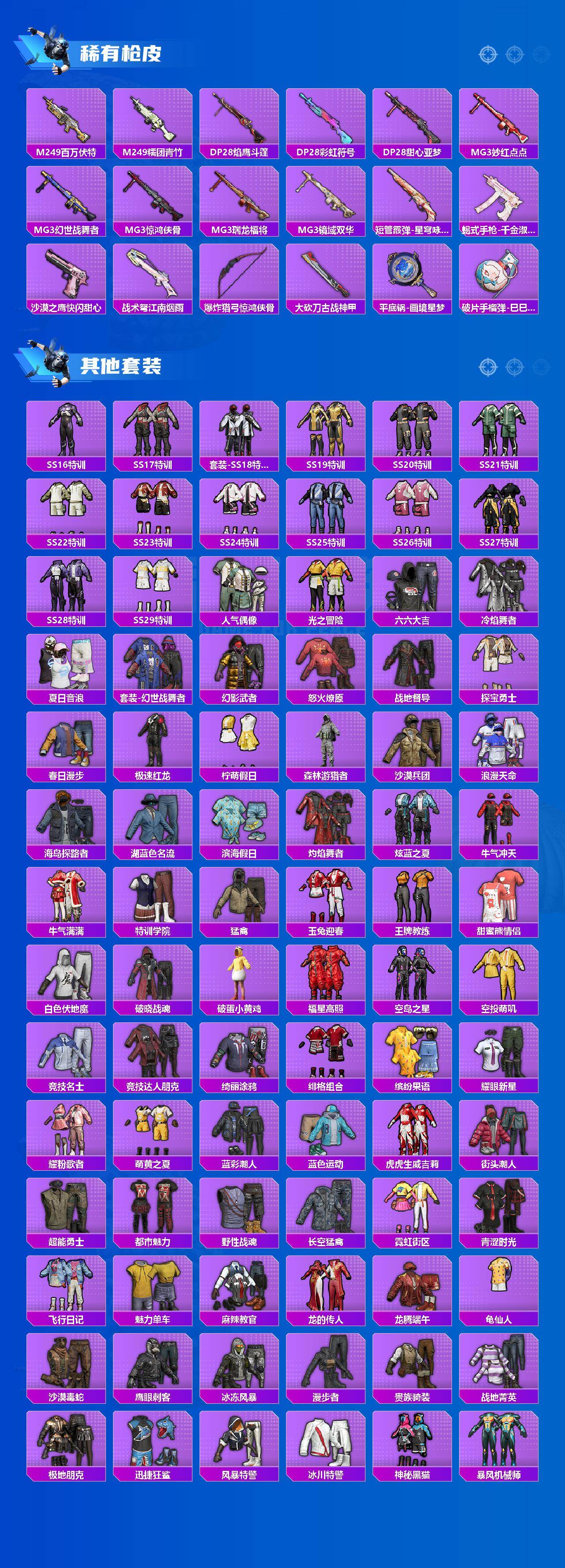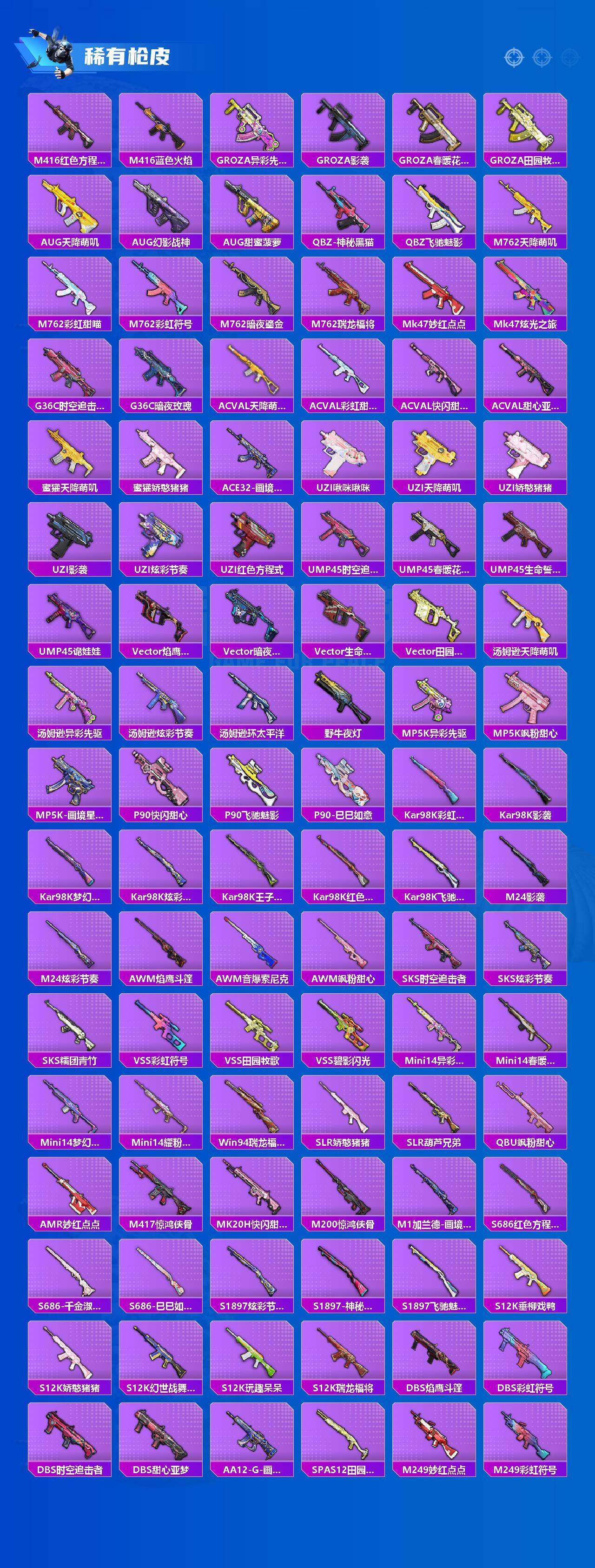 【稀有枪皮】:AKM-冰凉西瓜,AKM-彩虹符号,AKM-影袭,AKM-灼热熔岩,AKM-生命誓言,AKM-虎虎生威,AKM-霓虹街区,AKM-龙的传人,M16A4-幻世战舞者,M16A4-甜心亚梦,M16A4-红色方程式,M16A4-蓝色火焰,M16A4-千金淑猫,SCAR-L-凝视深渊,SCAR-L-玉兔迎春,SCAR-L-红色方程式,SCAR-L-黄金龙骨,M416-糯团青竹,M416-红色方程式,M416-蓝色火焰,GROZA-异彩先驱,GROZA-影袭,GROZA-春暖花开,GROZA-田园牧歌,AUG-天降萌叽,AUG-幻影战神,AUG-甜蜜菠萝,QBZ-神秘黑猫,QBZ-飞驰