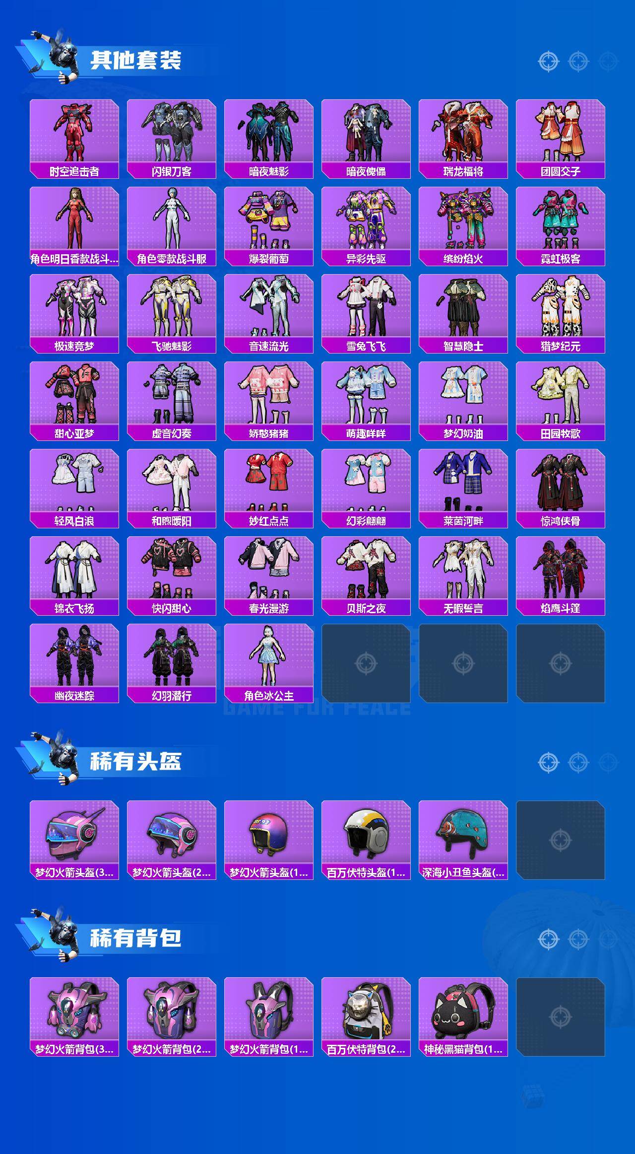 【粉色套装】:粉装-金曜白虎,粉装-梦幻火箭,粉装-童趣迷兔,角色-2号机款机体服,粉装-恐龙拽拽,角色-复仇流浪者,粉装-第五大道,角色-美雪,角色-千金淑猫,角色-樱桃泡泡