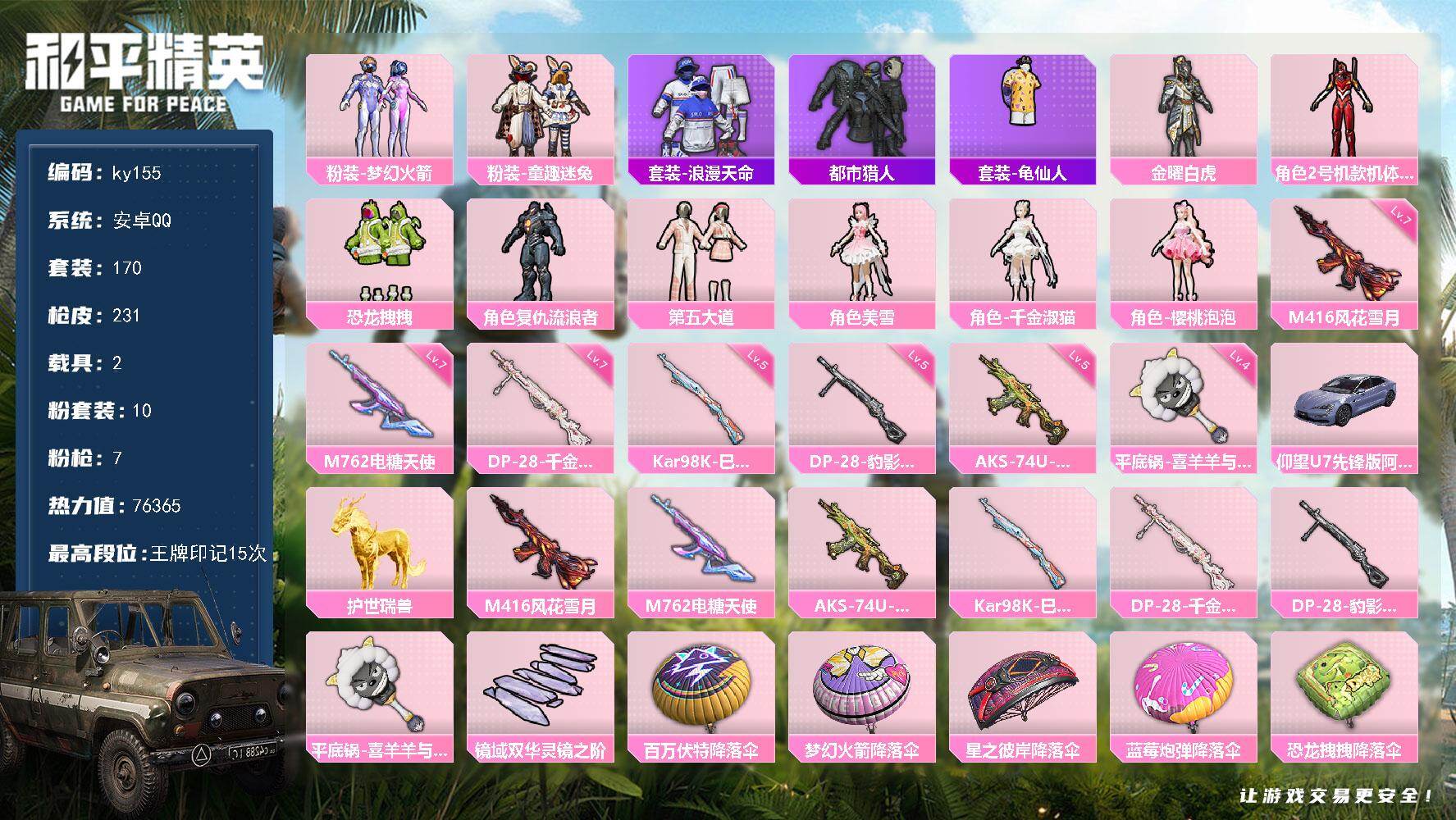 [16871361]安卓 手Q-10粉装-7特效枪-2载具-1粉色飞行器-76365热力值-15王牌印记-170套装-231枪皮