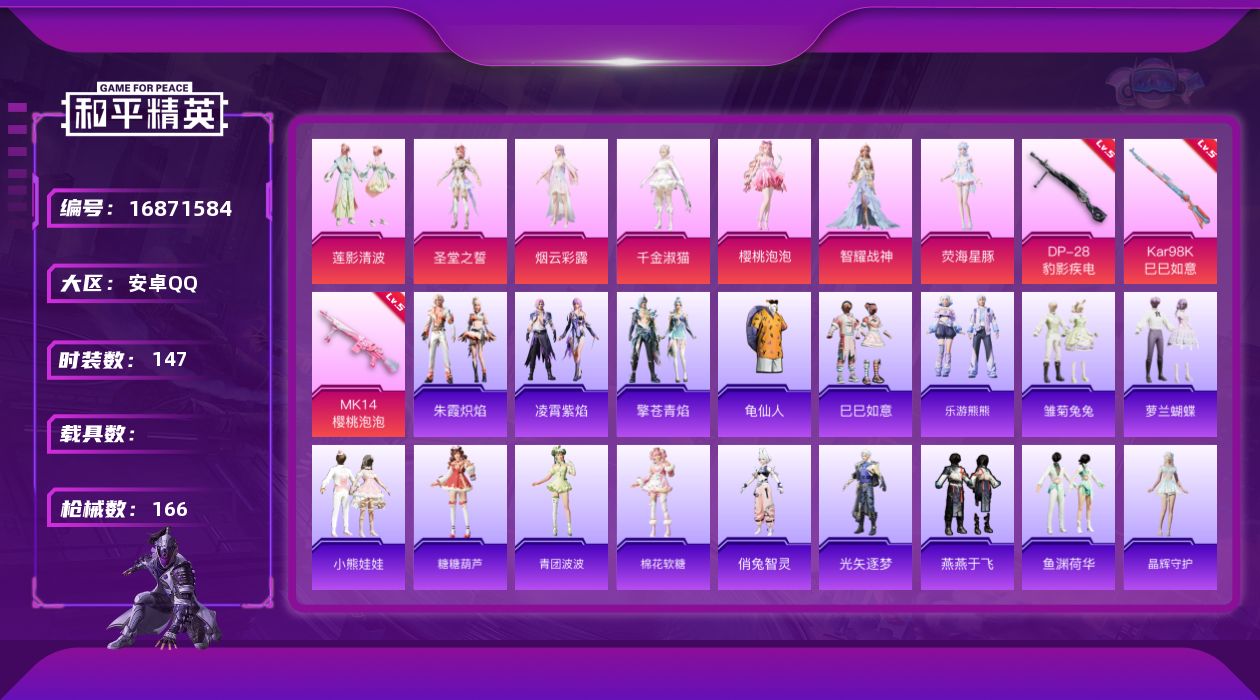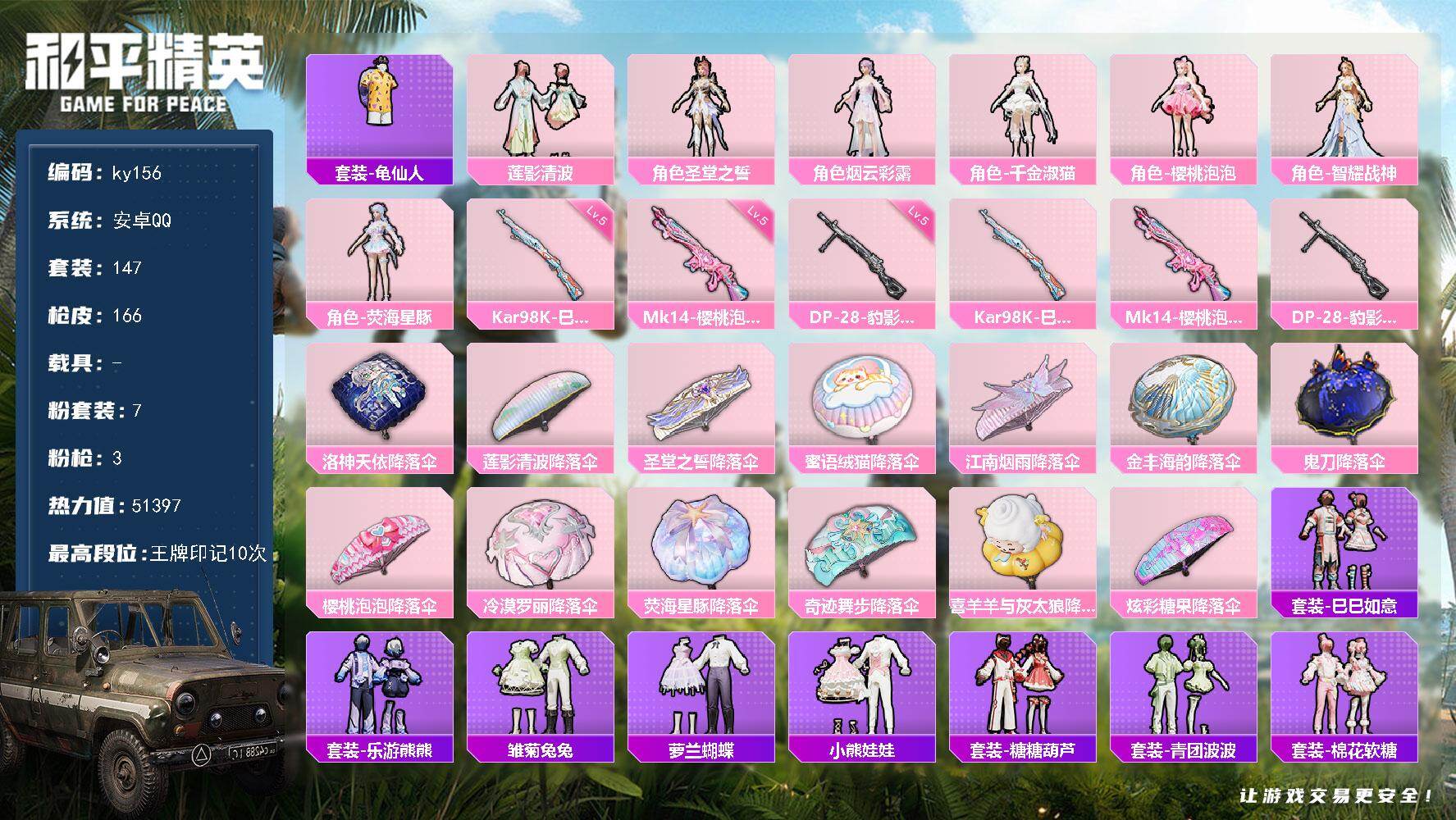 [16871584]安卓 手Q-7粉装-3特效枪-0载具-0粉色飞行器-51397热力值-10王牌印记-147套装-166枪皮