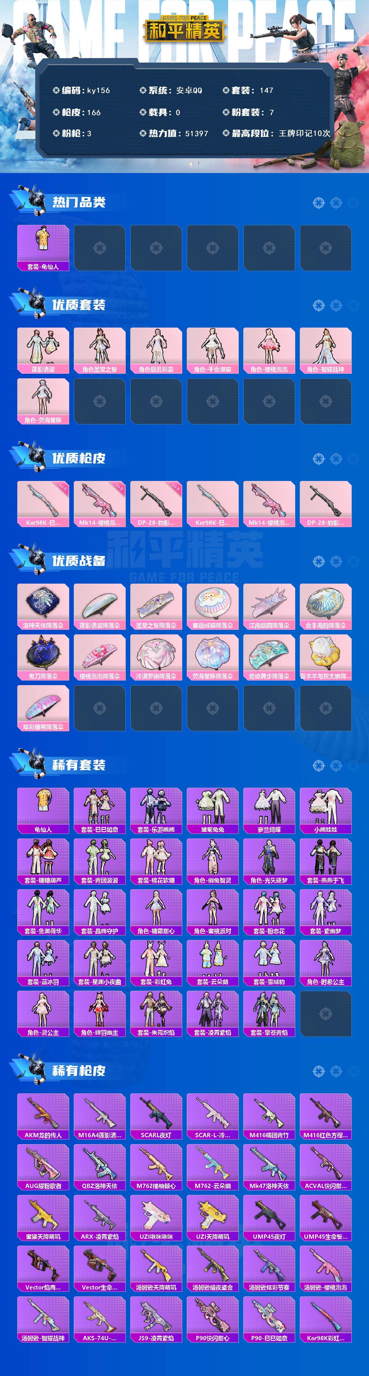 [16871584]安卓 手Q-7粉装-3特效枪-0载具-0粉色飞行器-51397热力值-10王牌印记-147套装-166枪皮 【热门品类】:套装-龟仙人 【粉色套装】:粉装-莲影清波,角色-圣堂之誓,角色-烟云彩露,角色-千金淑猫,角色-樱桃泡泡,角色-智耀战神,角色-荧海星豚 【粉色枪皮等级】:Kar98K-巳巳如意(五级),Mk14-樱桃泡泡(五级),DP-28-豹影疾电(五级) 【粉色枪皮】:Kar98K-巳巳如意,Mk14-樱桃泡泡,DP-28-豹影疾电 【粉色降落伞】:洛神天依降落伞,莲影清波降落伞,圣堂之誓降落伞,蜜语绒猫降落伞,江南烟雨降落伞,金丰海韵降落伞,鬼刀降落伞,樱桃泡泡降落伞,冷漠罗丽降落伞,荧海星豚降落伞,奇迹舞步降落伞,喜羊羊与灰太狼降落伞,炫彩糖果降落伞 【稀有套装】:套装-龟仙人,套装-巳巳如意,套装-乐游熊熊,套装-雏菊兔兔,套装-萝兰蝴蝶,套装-小熊娃娃,套装-糖糖葫芦,套装-青团波波,套装-棉花软糖,角色-俏兔智灵,角色-光矢逐梦,套装-燕燕于飞,套装-鱼渊荷华,套装-晶辉守护,角色-糖霜甜心,角色-蜜桃派对,套装-粉恋花,套装-紫幽梦,套装-蓝冰羽,套装-星渊小夜曲,套装-彩虹兔,套装-云朵鹅,套装-雪绒豹,角色-时希公主,角色-灵公主,角色-绛羽幽主,套装-朱霞炽焰,套装-凌霄紫焰,套装-擎苍青焰 【稀有枪皮】:AKM-龙的传人,M16A4-莲影清波,SCAR-L-夜灯,SCAR-L-冷漠罗丽,M416-糯团青竹,M416-红色方程式,AUG-耀粉歌者,QBZ-洛神天依,M762-橘柚倾心,M762-云朵鹅,Mk47-洛神天依,AC-VAL-快闪甜心,蜜獾-天降萌叽,ARX-凌霄紫焰,UZI-啾咪啾咪,UZI-天降萌叽,UMP45-夜灯,UMP45-生命誓言,Vector-焰鹰斗篷,Vector-生命誓言,汤姆逊-天降萌叽,汤姆逊-暗夜鎏金,汤姆逊-炫彩节奏,汤姆逊-樱桃泡泡,汤姆逊-智耀战神,AKS-74U-鬼刀,JS9-凌霄紫焰,P90-快闪甜心,P90-巳巳如意,Kar98K-彩虹符号,M24-樱桃泡泡,AWM-焰鹰斗篷,AWM-圣堂之誓,AWM-暮色玫影,VSS-彩虹符号,Mini14-阿狸红,莫辛纳甘-蜜语绒猫,AMR-喜羊羊与灰太狼,AMR-鬼刀,MK20-H-快闪甜心,MK20-H-莲影清波,MK20-H-樱桃泡泡,SVD-云