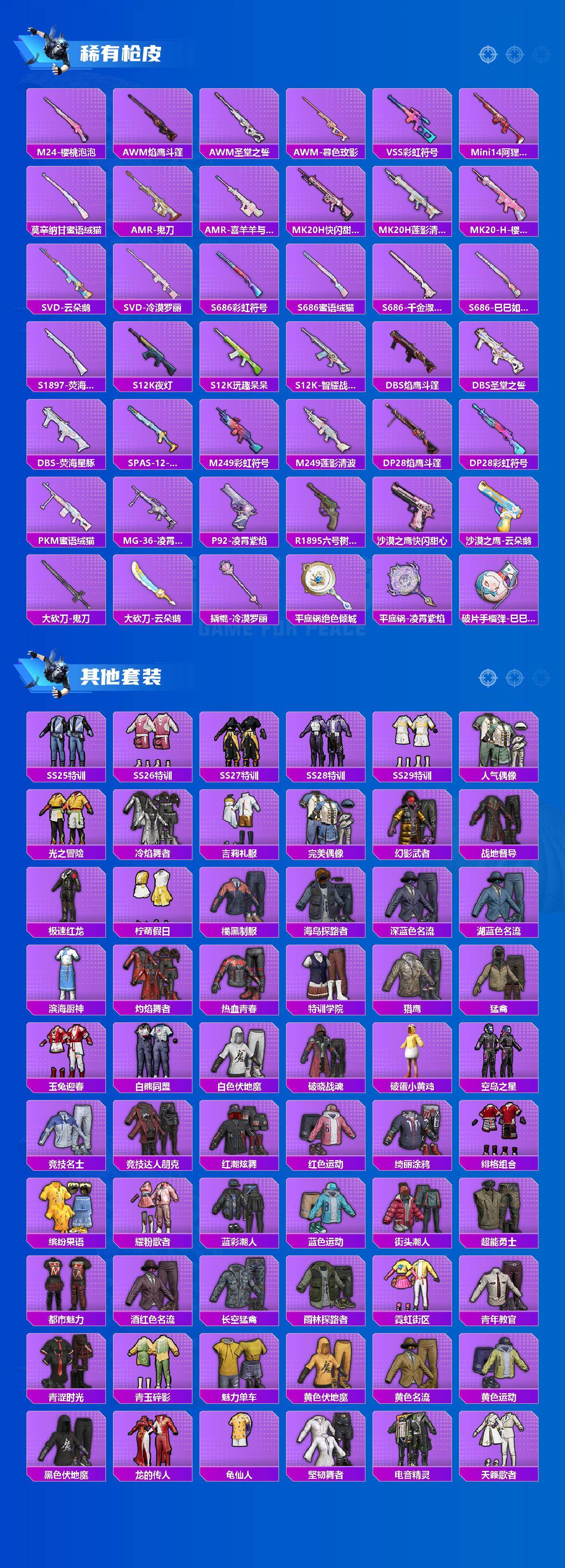 【稀有枪皮】:AKM-龙的传人,M16A4-莲影清波,SCAR-L-夜灯,SCAR-L-冷漠罗丽,M416-糯团青竹,M416-红色方程式,AUG-耀粉歌者,QBZ-洛神天依,M762-橘柚倾心,M762-云朵鹅,Mk47-洛神天依,AC-VAL-快闪甜心,蜜獾-天降萌叽,ARX-凌霄紫焰,UZI-啾咪啾咪,UZI-天降萌叽,UMP45-夜灯,UMP45-生命誓言,Vector-焰鹰斗篷,Vector-生命誓言,汤姆逊-天降萌叽,汤姆逊-暗夜鎏金,汤姆逊-炫彩节奏,汤姆逊-樱桃泡泡,汤姆逊-智耀战神,AKS-74U-鬼刀,JS9-凌霄紫焰,P90-快闪甜心,P90-巳巳如意,Kar98K-彩虹符号,M24-樱桃泡泡,AWM-焰鹰斗篷,AWM-圣堂之誓,AWM-暮色玫影,VSS-彩虹符号,Mini14-阿狸红,莫辛纳甘-蜜语绒猫,AMR-喜羊羊与灰太狼,AMR-鬼刀,MK20-H-快闪甜心,MK20-H-莲影清波,MK20-H-樱桃泡泡,SVD-云