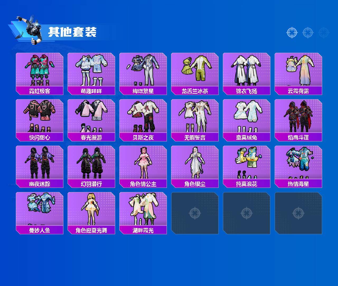 【稀有套装】:套装-龟仙人,套装-巳巳如意,套装-乐游熊熊,套装-雏菊兔兔,套装-萝兰蝴蝶,套装-小熊娃娃,套装-糖糖葫芦,套装-青团波波,套装-棉花软糖,角色-俏兔智灵,角色-光矢逐梦,套装-燕燕于飞,套装-鱼渊荷华,套装-晶辉守护,角色-糖霜甜心,角色-蜜桃派对,套装-粉恋花,套装-紫幽梦,套装-蓝冰羽,套装-星渊小夜曲,套装-彩虹兔,套装-云朵鹅,套装-雪绒豹,角色-时希公主,角色-灵公主,角色-绛羽幽主,套装-朱霞炽焰,套装-凌霄紫焰,套装-擎苍青焰