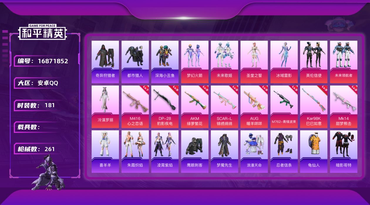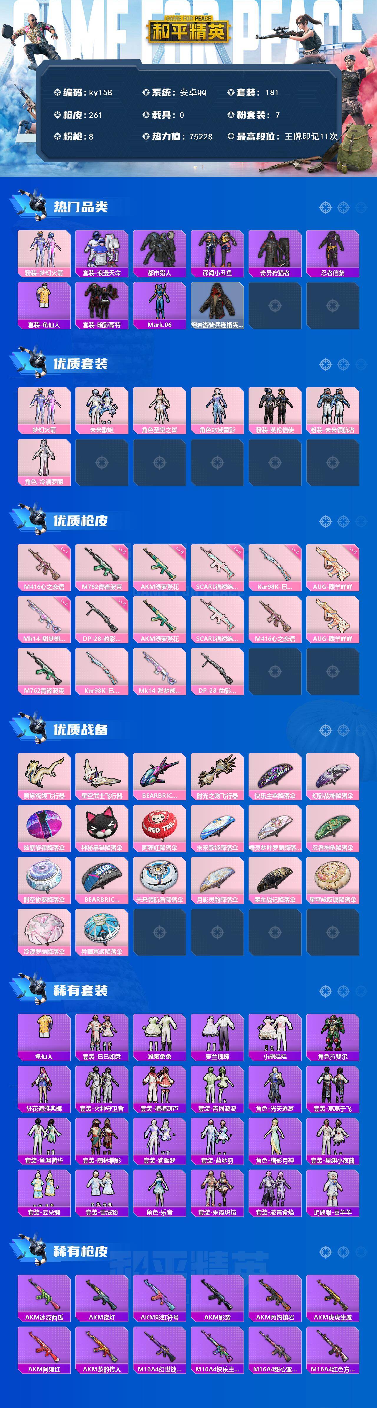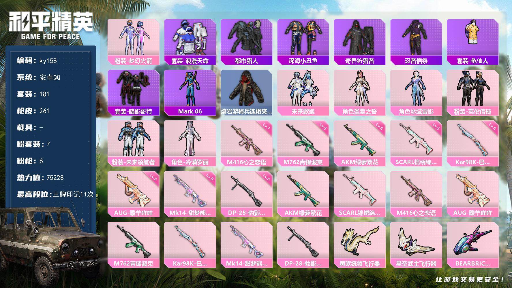 [16871852]安卓 手Q-7粉装-8特效枪-0载具-4粉色飞行器-75228热力值-11王牌印记-181套装-261枪皮 【热门品类】:粉装-梦幻火箭,套装-浪漫天命,套装-都市猎人,套装-深海小丑鱼,套装-奇异狩猎者,套装-忍者信条,套装-龟仙人,套装-暗影哥特,角色-Mark.06,熔岩游骑兵连帽夹克 【粉色套装】:粉装-梦幻火箭,粉装-未来歌姬,角色-圣堂之誓,角色-冰域雷影,粉装-英伦信使,粉装-未来领航者,角色-冷漠罗丽 【粉色枪皮等级】:AKM-绿萝繁花(五级),SCAR-L-锦绣绵绵(五级),M416-心之恋语(七级),AUG-暖羊咩咩(五级),M762-青锋波束(五级),Kar98K-巳巳如意(五级),Mk14-甜梦熊击(五级),DP-28-豹影疾电(五级) 【粉色枪皮】:AKM-绿萝繁花,SCAR-L-锦绣绵绵,M416-心之恋语,AUG-暖羊咩咩,M762-青锋波束,Kar98K-巳巳如意,Mk14-甜梦熊击,DP-28-豹影疾电 【粉色飞行器】:黄族统领飞行器,星空武士飞行器,BEARBRICK飞行器,时光之吻飞行器 【粉色降落伞】:快乐主宰降落伞,幻影战神降落伞,炫紫旋律降落伞,神秘黑猫降落伞,阿狸红降落伞,未来歌姬降落伞,精灵梦叶罗丽降落伞,忍者神龟降落伞,时空协奏降落伞,BEARBRICK降落伞,未来领航者降落伞,月影灵韵降落伞,墨金战记降落伞,星穹咏叹调降落伞,冷漠罗丽降落伞,异瞳寒姬降落伞 【稀有套装】:套装-龟仙人,套装-巳巳如意,套装-雏菊兔兔,套装-萝兰蝴蝶,套装-小熊娃娃,角色-拉斐尔,角色-狂花道·雅典娜,套装-火种守卫者,套装-糖糖葫芦,套装-青团波波,角色-光矢逐梦,套装-燕燕于飞,套装-鱼渊荷华,套装-雨林猎影,套装-紫幽梦,套装-蓝冰羽,角色-猎影月神,套装-星渊小夜曲,套装-云朵鹅,套装-雪绒豹,角色-乐音,套装-朱霞炽焰,套装-凌霄紫焰,玩偶服-喜羊羊 【稀有枪皮】:AKM-冰凉西瓜,AKM-夜灯,AKM-彩虹符号,AKM-影袭,AKM-灼热熔岩,AKM-虎虎生威,AKM-阿狸红,AKM-龙的传人,M16A4-幻世战舞者,M16A4-快乐主宰,M16A4-甜心亚梦,M16A4-红色方程式,SCAR-L-炫彩节奏,SCAR-L-玉兔迎春,SCAR-L-黄金龙骨,M416-糯团青竹,M416-绯红前夜,M416-绿野极光,M41