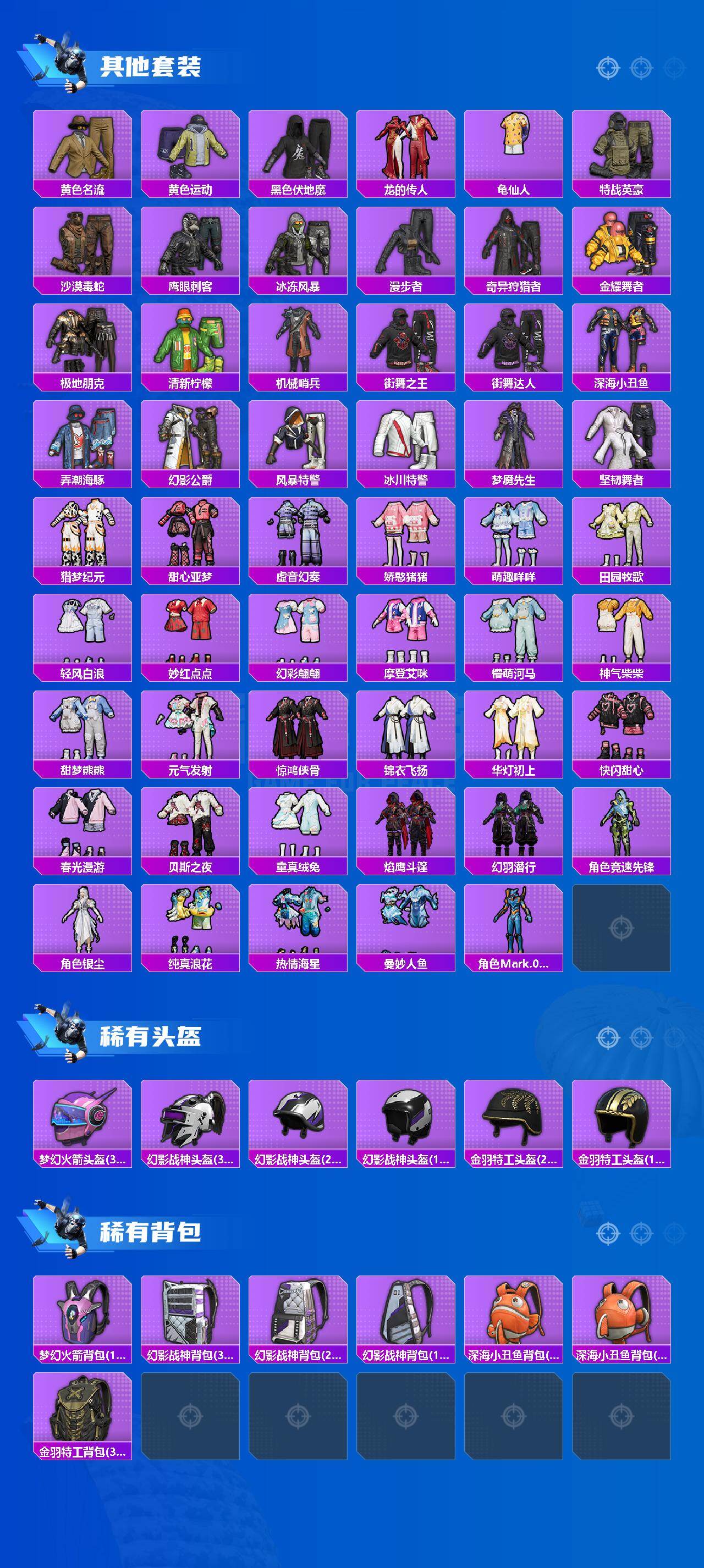 套装-梦幻火箭,套装-都市猎人,套装-深海小丑鱼,套装-奇异狩猎者,套装-未来歌姬,角色-圣堂之誓,角色-冰域雷影,套装-未来领航者,套装-鹰眼刺客,套装-梦魇先生