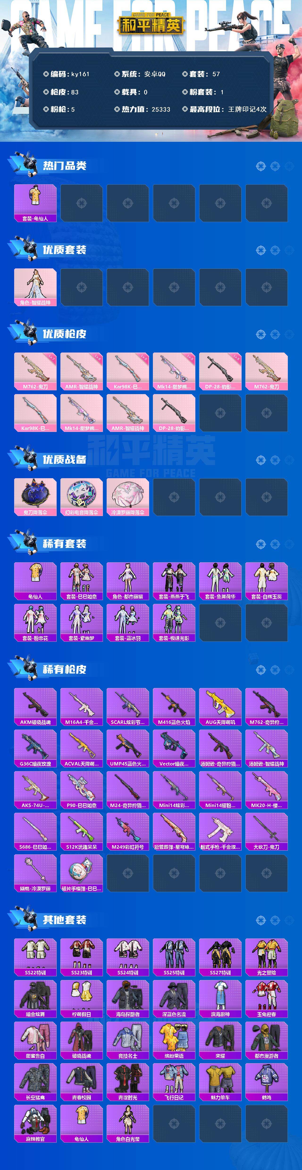 [16872147]安卓 手Q-1粉装-5特效枪-0载具-0粉色飞行器-25333热力值-4王牌印记-57套装-83枪皮 【热门品类】:套装-龟仙人 【粉色套装】:角色-智耀战神 【粉色枪皮等级】:M762-鬼刀(七级),Kar98K-巳巳如意(五级),Mk14-甜梦熊击(五级),AMR-智耀战神(六级),DP-28-豹影疾电(五级) 【粉色枪皮】:M762-鬼刀,Kar98K-巳巳如意,Mk14-甜梦熊击,AMR-智耀战神,DP-28-豹影疾电 【粉色降落伞】:鬼刀降落伞,幻彩电音降落伞,冷漠罗丽降落伞 【稀有套装】:套装-龟仙人,套装-巳巳如意,角色-都市丽猫,套装-燕燕于飞,套装-鱼渊荷华,套装-白辉玉蕊,套装-粉恋花,套装-紫幽梦,套装-蓝冰羽,套装-极速光影 【稀有枪皮】:AKM-破晓战魂,M16A4-千金淑猫,SCAR-L-炫彩节奏,M416-蓝色火焰,AUG-天降萌叽,M762-奇异狩猎者,G36C-暗夜玫瑰,AC-VAL-天降萌叽,UMP45-蓝色火焰,Vector-暗夜玫瑰,汤姆逊-奇异狩猎者,汤姆逊-智耀战神,AKS-74U-鬼刀,P90-巳巳如意,M24-奇异狩猎者,Mini14-炫彩节奏,Mini14-耀粉歌者,MK20-H-樱桃泡泡,S686-巳巳如意,S12K-玩趣呆呆,M249-彩虹符号,短管霰弹-星穹咏叹调,蝎式手枪-千金淑猫,大砍刀-鬼刀,撬棍-冷漠罗丽,破片手榴弹-巳巳如意 【其他套装】:套装-SS22特训,套装-SS23特训,套装-SS24特训,套装-SS25特训,套装-SS27特训,套装-光之冒险,套装-暗金炫舞,套装-柠萌假日,套装-海岛探路者,套装-深蓝色名流,套装-滨海厨神,套装-玉兔迎春,套装-甜蜜告白,套装-破晓战魂,套装-竞技名士,套装-缤纷果语,套装-荣耀,套装-都市漫游者,套装-长空猛禽,套装-青春校园,套装-青涩时光,套装-飞行日记,套装-魅力单车,套装-鹤鸣,套装-麻辣教官,套装-龟仙人,角色-白光莹 【营地ID】:794051617