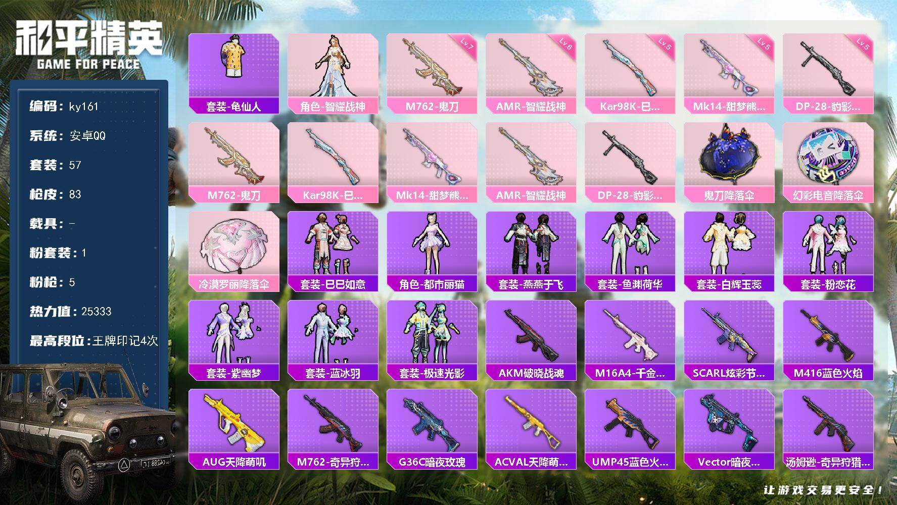 [16872147]安卓 手Q-1粉装-5特效枪-0载具-0粉色飞行器-25333热力值-4王牌印记-57套装-83枪皮