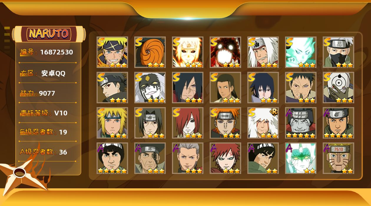 【A级忍者】:艾「青年」(2星),长门「青年」(2星),波风水门「青年」(2星),迪达拉(2星),飞段(3星),飞段「死司凭血」(2星),干柿鬼鲛(5星),漩涡博人「桃式显现」(2星),漩涡鸣人「九尾查克拉」(2星),机械鸣人「初始形态」(2星),迈特凯(5星),旗木卡卡西「忍界大战」(2星),旗木卡卡西「幻之真容」(2星),桃地再不斩「秽土转生」(2星),我爱罗「疾风传」(3星),蝎(2星),蝎「绯流琥」(2星),角都「秽土转生」(2星),猿飞阿斯玛(5星),宇智波止水(2星),宇智波鼬(2星),宇智波佐助「须佐能乎」(2星),宇智波佐助「万花筒写轮眼」(2星),日向宁次「忍界大战」(2星),长十郎「六代目水影」(2星),佩恩·六道「漂泊浪客」(2星),李洛克「忍界大战」(2星),黑土「博人传」(2星),秋道丁次「忍界大战」(2星),千代「近松十人卫」(2星),神农「羁绊」(2星),土台「忍界大战」(3星),不缘(2星),宇智波泉奈(2星),巳月「仙人模式」(2星),迈特凯「青春爆炸」(2星)