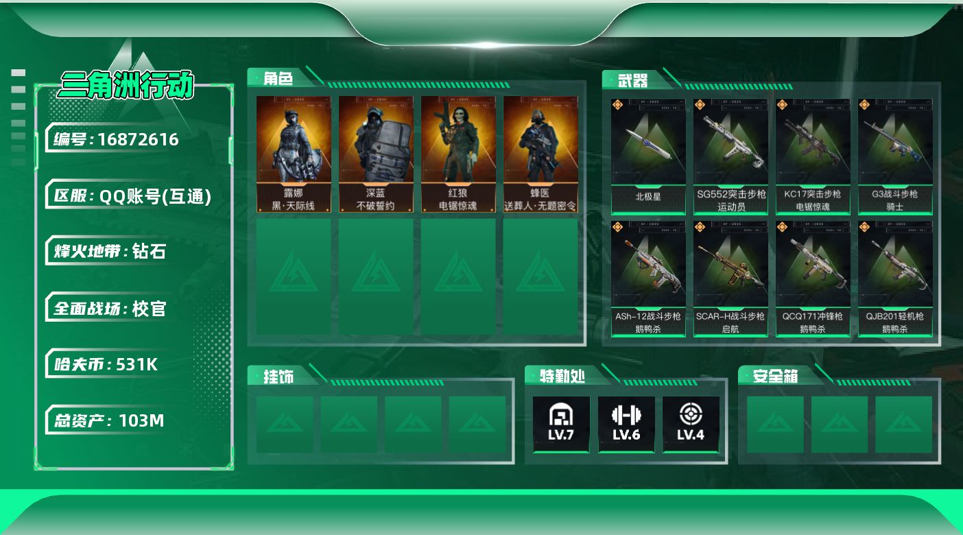 [16872616]可二次【店主推荐简陋号!可直接换绑】103m总资产-531k哈伏币-60烽火等级-钻石-50战场等级-校官 【干员外观】:露娜-黑·天际线,蜂医-送葬人·无题密令,深蓝-不破誓约,红狼-电锯惊魂 【近战皮肤】:近战-北极星,近战-黑鹰 【传说外观】:M4A1突击步枪-蚀金玫瑰,M4A1突击步枪-阿米娅,ASh-12战斗步枪-鹅鸭杀,SG552突击步枪-运动员,AK-12突击步枪-特斯拉线圈,SCAR-H战斗步枪-启航,G3战斗步枪-骑士,CAR-15突击步枪-阿米娅,腾龙突击步枪-捞点薯条,K437突击步枪-北极星,KC17突击步枪-电锯惊魂,Vector冲锋枪-能天使-午夜邮差,UZI冲锋枪-特斯拉线圈,SR-3M紧凑突击步枪-特斯拉线圈,勇士冲锋枪-能天使-午夜邮差,QCQ171冲锋枪-北极星,QCQ171冲锋枪-鹅鸭杀,725双管霰弹枪-送葬人-无题密令,M250通用机枪-骑士之心,QJB201轻机枪-鹅鸭杀,R93狙击步枪-维什戴尔,AWM狙击步枪-捞点薯条,93R-捞点薯条,复合弓-黑·天际线 【史诗外观】:SR-25射手步枪-天命,ASh-12战斗步枪-无极限,M16A4突击步枪-竞赛选手,AUG突击步枪-蝮蛇,SG552突击步枪-深海恐惧,G3战斗步枪-流沙送葬,PTR-32突击步枪-工业狂潮,AS Val突击步枪-百步穿杨,腾龙突击步枪-无垢,腾龙突击步枪-猎鳄行动,K437突击步枪-守护者,MP5冲锋枪-深海恐惧,MP5冲锋枪-战术竞备,MP5冲锋枪-竞技风,P90冲锋枪-莫斯提马,Vector冲锋枪-百步穿杨,SR-3M紧凑突击步枪-荒野求生,SR-3M紧凑突击步枪-战术竞备,勇士冲锋枪-深海恐惧,勇士冲锋枪-工业狂潮,MP7冲锋枪-无垢,MP7冲锋枪-守护者,PKM通用机枪-荒野求生,M250通用机枪-囚徒,Mini-14射手步枪-守护者,SVD狙击步枪-荒野求生,PSG-1射手步枪-无垢,SV-98狙击步枪-林中猎手,SV-98狙击步枪-囚徒,R93狙击步枪-竞赛选手,M700狙击步枪-竞技风,M700狙击步枪-蝮蛇,M700狙击步枪-百步穿杨,M700狙击步枪-哈夫克警备,AWM狙击步枪-无极限,复合弓-守护者 【稀有外观】:SV-98狙击步枪-花岗岩,AUG突击步枪-旧梦,M4A1突击步枪-繁盛,AKM突击步枪-战术演练,AKM突击步枪