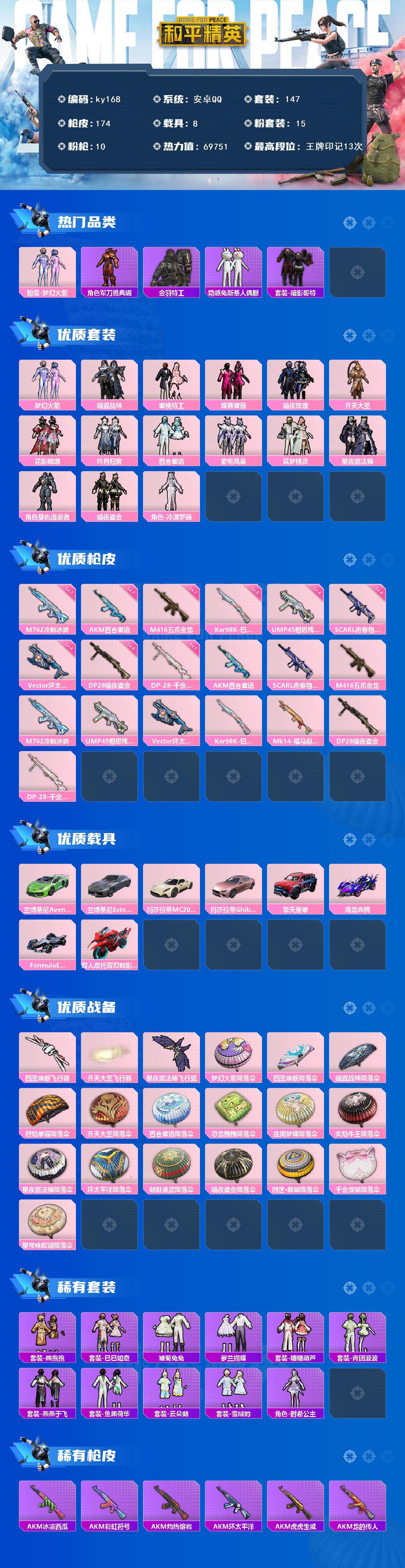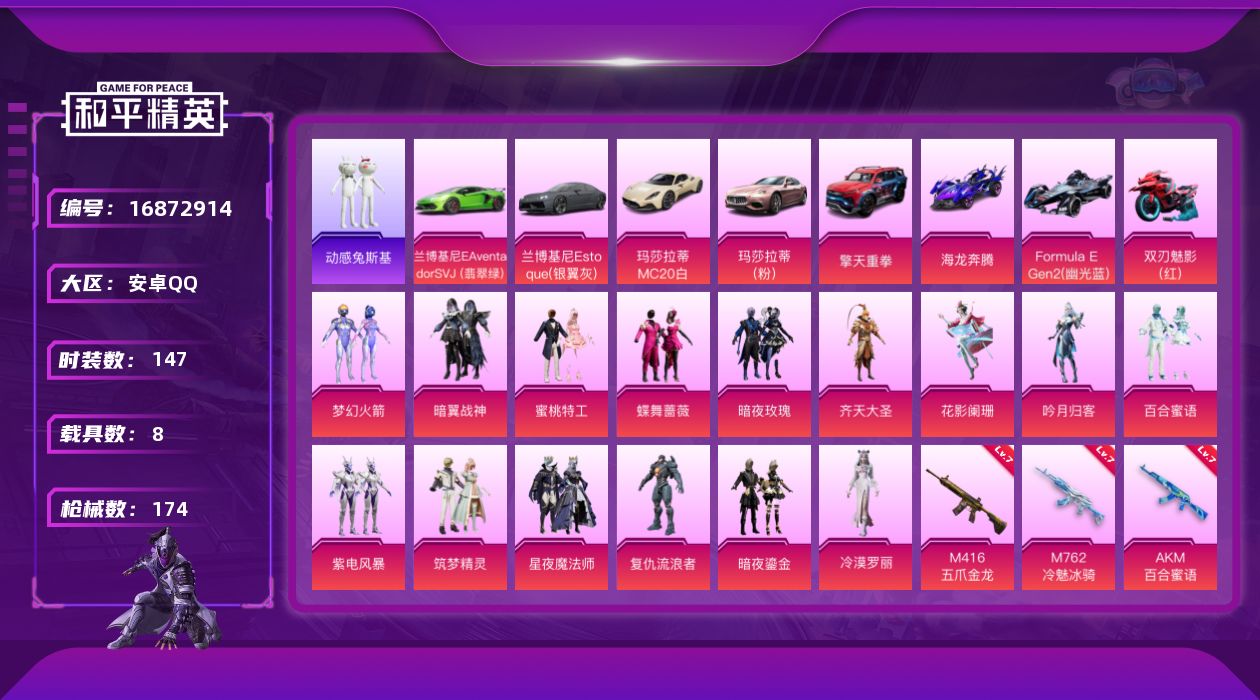 [16872914]安卓 手Q-15粉装-10特效枪-8载具-3粉色飞行器-69751热力值-13王牌印记-147套装-174枪皮 【热门品类】:粉装-梦幻火箭,角色-军刀雅典娜,套装-金羽特工,套装-动感兔斯基人偶服,套装-暗影哥特 【粉色套装】:粉装-梦幻火箭,粉装-暗翼战神,粉装-蜜桃特工,粉装-蝶舞蔷薇,粉装-暗夜玫瑰,粉装-齐天大圣,粉装-花影阑珊,粉装-吟月归客,粉装-百合蜜语,粉装-紫电风暴,粉装-筑梦精灵,粉装-星夜魔法师,角色-复仇流浪者,粉装-暗夜鎏金,角色-冷漠罗丽 【粉色枪皮等级】:AKM-百合蜜语(七级),SCAR-L-青春物语(四级),M416-五爪金龙(七级),M762-冷魅冰骑(七级),UMP45-相思残雪(四级),Vector-环太平洋(四级),Kar98K-巳巳如意(五级),DP-28-暗夜鎏金(四级),DP-28-千金淑猫(一级) 【粉色载具】:兰博基尼Aventador SVJ(翡翠绿),兰博基尼Estoque(银翼灰),玛莎拉蒂MC20(星石白),玛莎拉蒂Ghibli(粉),擎天重拳,海龙奔腾,Formula E Gen2(幽光蓝),双人摩托-双刃魅影(红) 【粉色枪皮】:AKM-百合蜜语,SCAR-L-青春物语,M416-五爪金龙,M762-冷魅冰骑,UMP45-相思残雪,Vector-环太平洋,Kar98K-巳巳如意,Mk14-福马献瑞,DP-28-暗夜鎏金,DP-28-千金淑猫 【粉色飞行器】:四圣焕新飞行器,齐天大圣飞行器,星夜魔法师飞行翼 【粉色降落伞】:梦幻火箭降落伞,四圣焕新降落伞,暗翼战神降落伞,烈焰拳霸降落伞,齐天大圣降落伞,百合蜜语降落伞,恐龙拽拽降落伞,庄周梦蝶降落伞,炙焰牛王降落伞,星夜魔法师降落伞,环太平洋降落伞,翩跹演武降落伞,暗夜鎏金降落伞,创世·救赎降落伞,千金淑猫降落伞,星穹咏叹调降落伞 【稀有套装】:套装-熊抱抱,套装-巳巳如意,套装-雏菊兔兔,套装-萝兰蝴蝶,套装-糖糖葫芦,套装-青团波波,套装-燕燕于飞,套装-鱼渊荷华,套装-云朵鹅,套装-雪绒豹,角色-时希公主 【稀有枪皮】:AKM-冰凉西瓜,AKM-彩虹符号,AKM-灼热熔岩,AKM-环太平洋,AKM-虎虎生威,AKM-龙的传人,M16A4-幻世战舞者,M16A4-甜心亚梦,SCAR-L-玉兔迎春,SCAR-L-碧影闪光,M416-仓鼠灰灰,M416