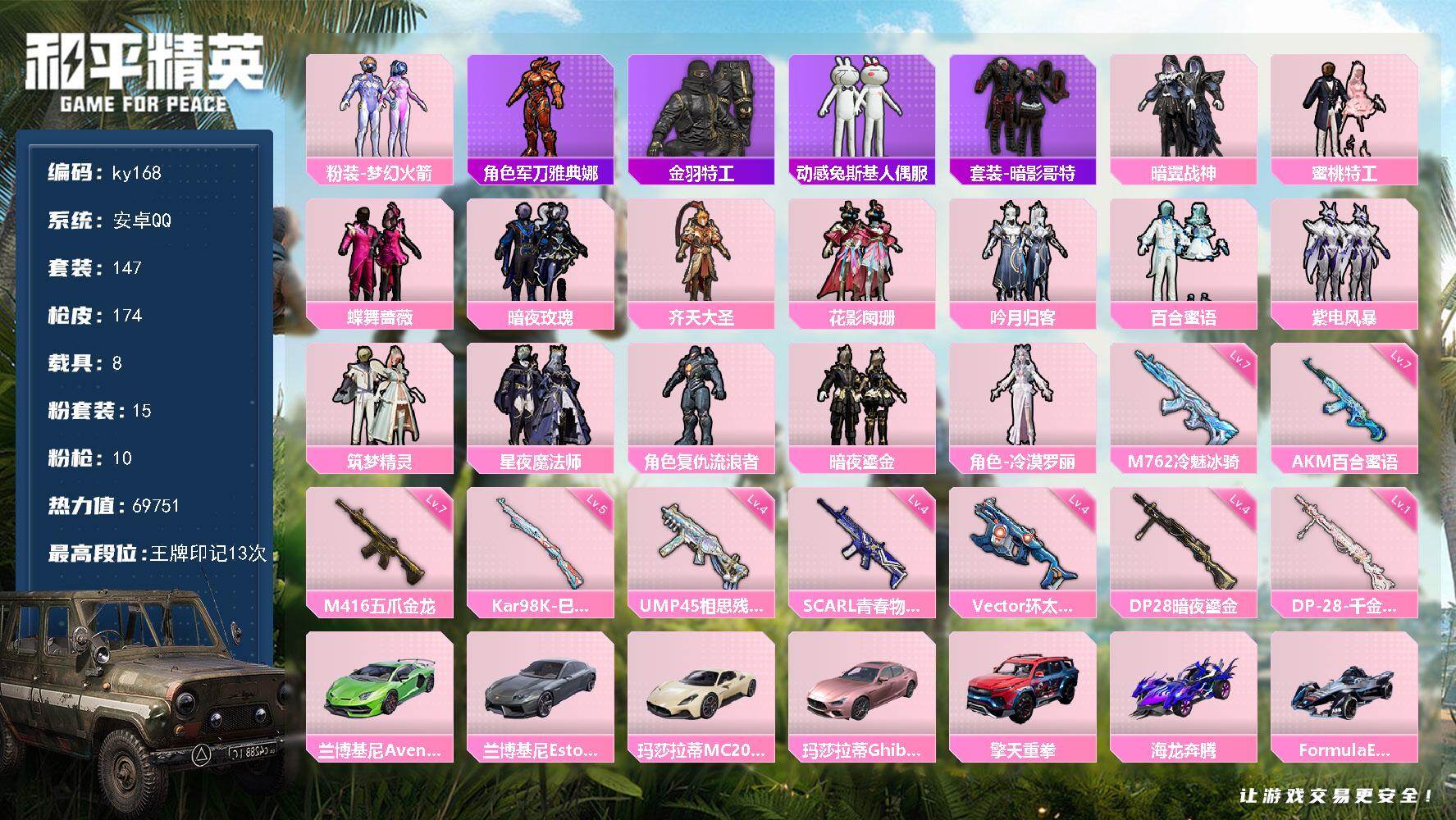 [16872914]安卓 手Q-15粉装-10特效枪-8载具-3粉色飞行器-69751热力值-13王牌印记-147套装-174枪皮