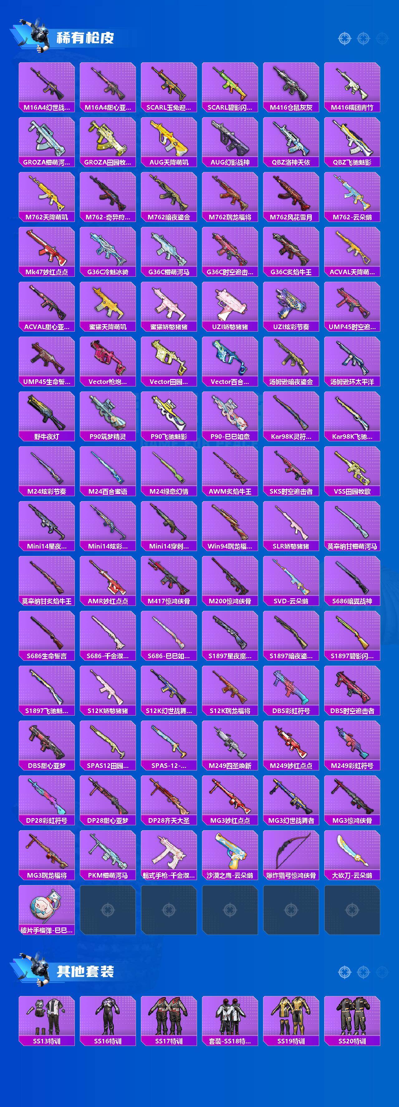 【稀有枪皮】:AKM-冰凉西瓜,AKM-彩虹符号,AKM-灼热熔岩,AKM-环太平洋,AKM-虎虎生威,AKM-龙的传人,M16A4-幻世战舞者,M16A4-甜心亚梦,SCAR-L-玉兔迎春,SCAR-L-碧影闪光,M416-仓鼠灰灰,M416