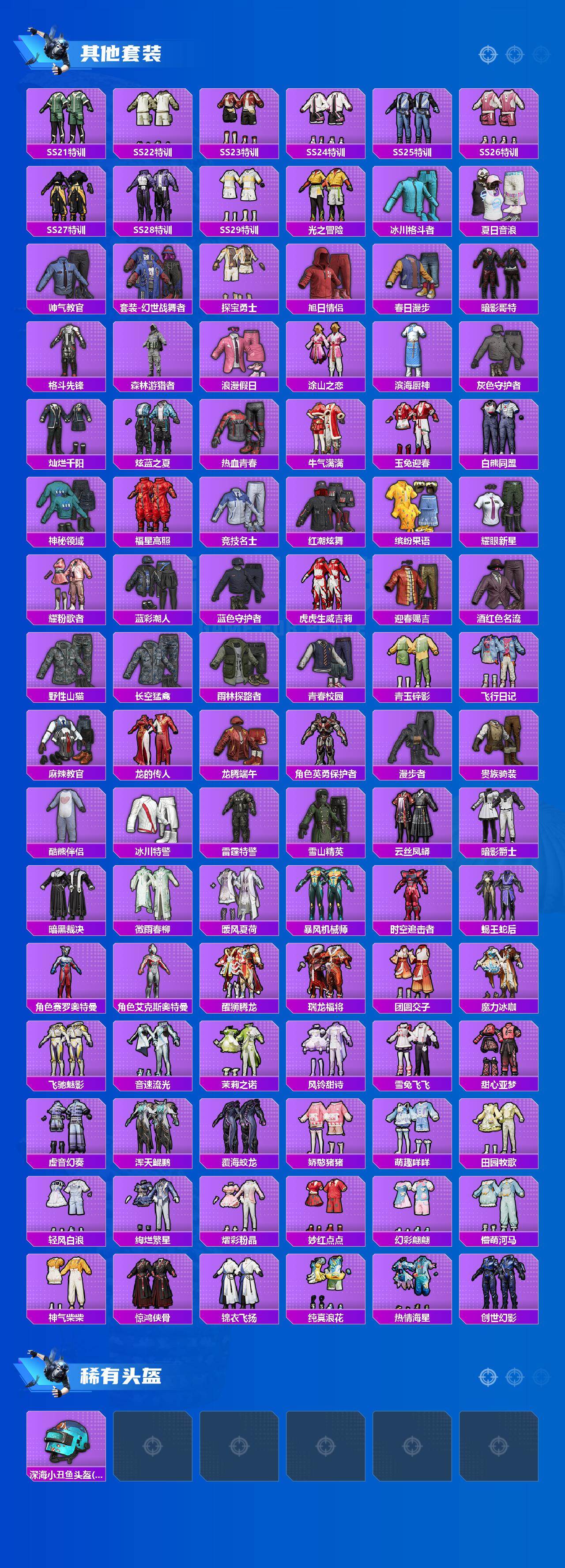 套装-梦幻火箭,套装-暗翼战神,套装-蜜桃特工,套装-蝶舞蔷薇,套装-暗夜玫瑰,套装-齐天大圣,套装-花影阑珊,套装-吟月归客,套装-百合蜜语,套装-紫电风暴,套装-筑梦精灵,套装-星夜魔法师,角色-复仇流浪者,套装-暗夜鎏金,酷熊伴侣套装