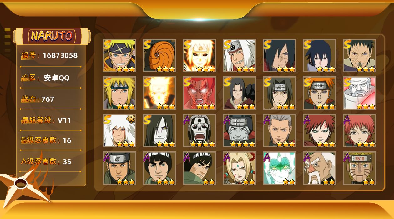 [16873058]16S级忍者数-35A级忍者数 【S级忍者】:宇智波鼬「秽土转生」(3星),宇智波斑「秽土转生·解」(3星),宇智波带土「忍界大战」(3星),宇智波鼬「须佐能乎」(3星),自来也「舞之豪杰」(3星),大蛇丸(3星),自来也「传说中的三忍」(3星),波风水门(3星),漩涡鸣人「九喇嘛连结」(3星),迈特凯「死门」(3星),佩恩「天道」(3星),宇智波佐助「永恒万花筒」(3星),大筒木金式(3星),波风水门「九喇嘛连结」(3星),宇智波斑「五影会谈」(3星),漩涡鸣人·宇智波佐助(3星) 【A级忍者】:艾「青年」(2星),长门「青年」(2星),波风水门「青年」(2星),大蛇丸「晓」(2星),飞段(3星),飞段「死司凭血」(4星),干柿鬼鲛(4星),漩涡博人「桃式显现」(2星),漩涡鸣人「九尾查克拉」(2星),机械鸣人「初始形态」(2星),迈特凯(3星),桃地再不斩「秽土转生」(2星),我爱罗「疾风传」(3星),蝎(3星),角都「秽土转生」(2星),猿飞阿斯玛(3星),宇智波鼬「夏日限定」(2星),宇智波佐助「须佐能乎」(2星),宇智波佐助「万花筒写轮眼」(2星),药师兜「半蛇斗篷」(2星),照美冥「五代目水影」(2星),日向宁次「忍界大战」(2星),日向雏田「最终章」(2星),宇智波带土「漂泊浪客」(2星),长十郎「六代目水影」(2星),黑土「博人传」(2星),秋道丁次「忍界大战」(2星),千代「近松十人卫」(2星),神农「羁绊」(2星),不缘(2星),宇智波泉奈(2星),大野木「侠隐江湖」(2星),巳月「仙人模式」(2星),纲手「妖怪奇谭」(2星),迈特凯「青春爆炸」(2星)