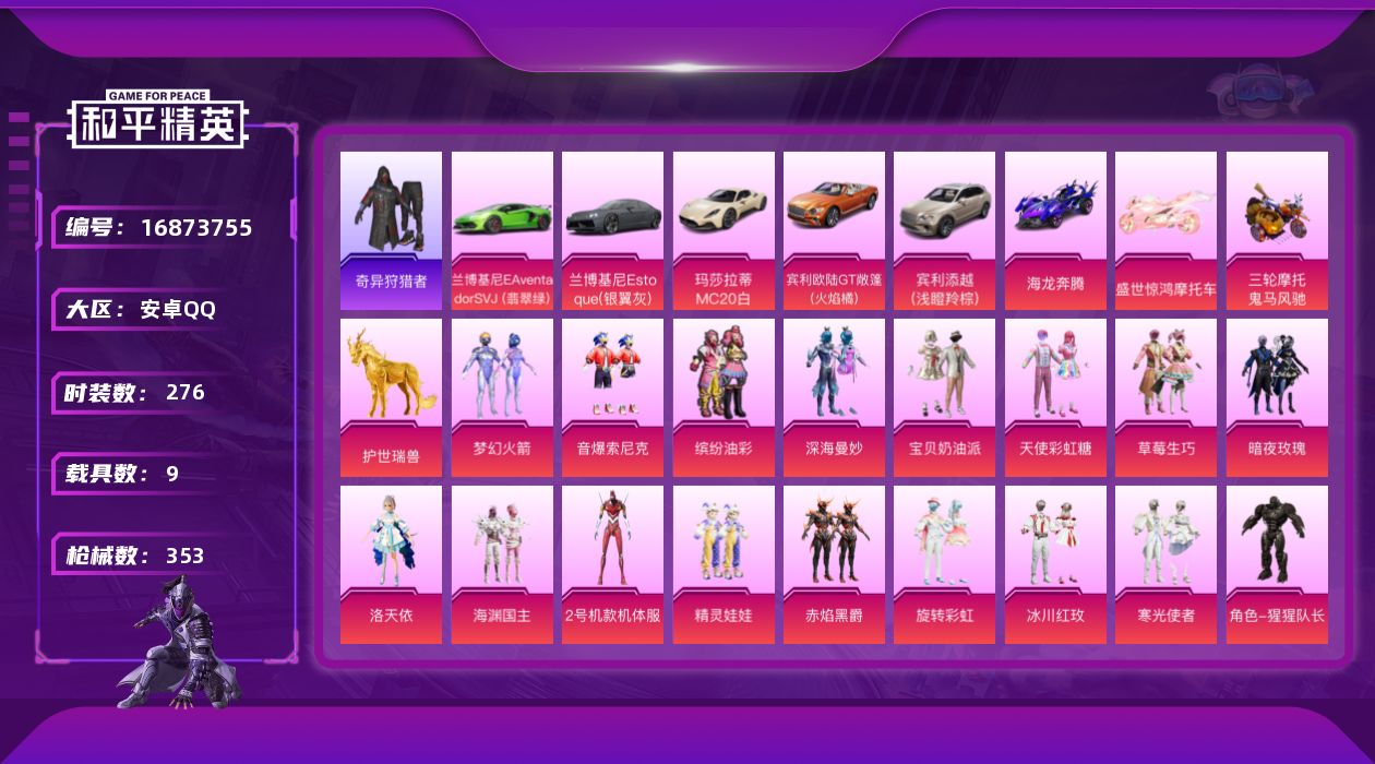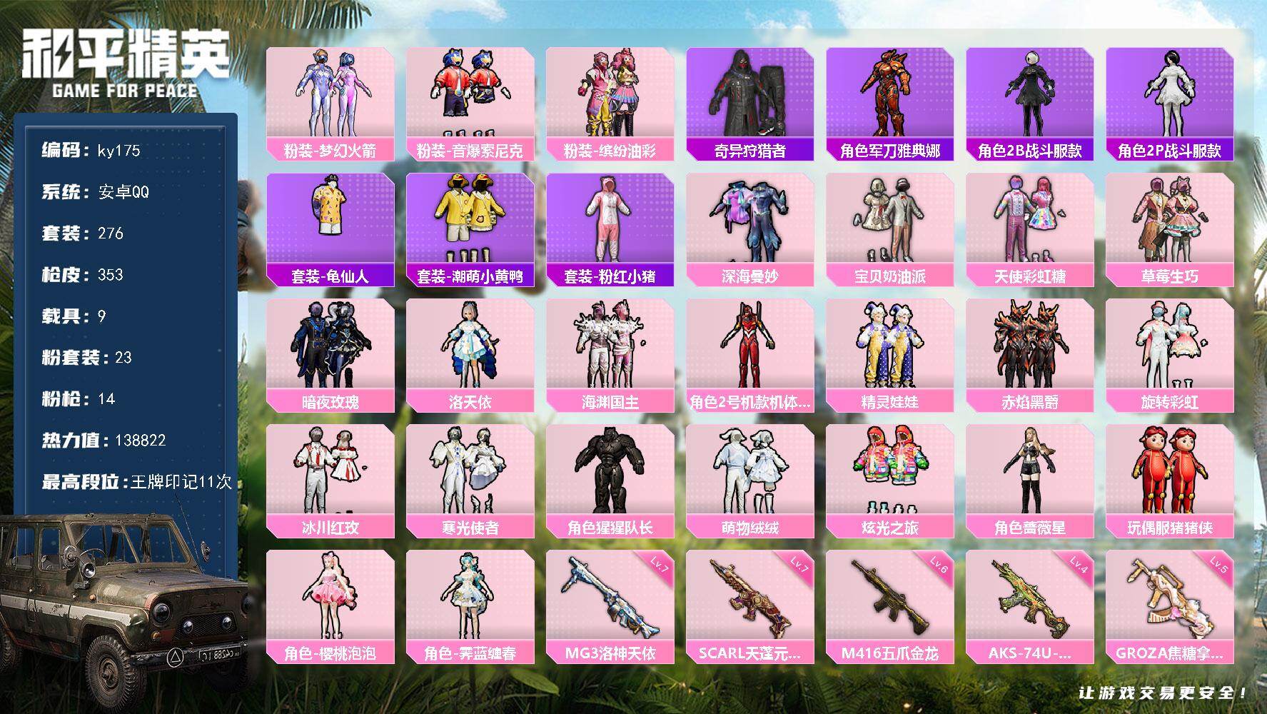 [16873755]安卓 手Q-23粉装-14特效枪-9载具-12粉色飞行器-138822热力值-11王牌印记-276套装-353枪皮