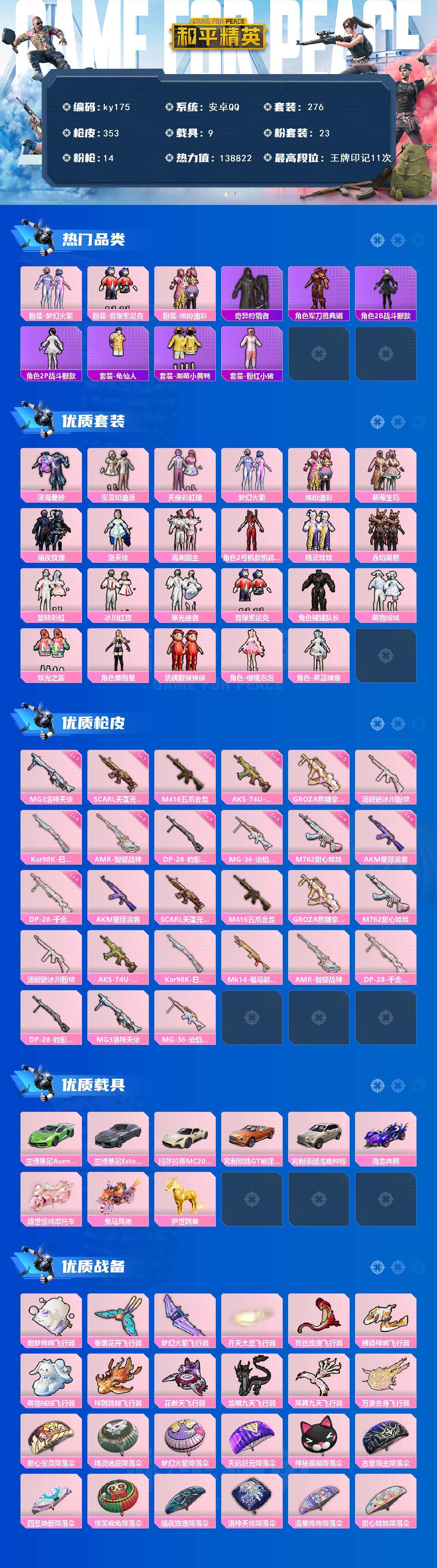 [16873755]安卓 手Q-23粉装-14特效枪-9载具-12粉色飞行器-138822热力值-11王牌印记-276套装-353枪皮 【热门品类】:粉装-梦幻火箭,粉装-音爆索尼克,粉装-缤纷油彩,套装-奇异狩猎者,角色-军刀雅典娜,角色-2B战斗服款,角色-2P战斗服款,套装-龟仙人,套装-潮萌小黄鸭,套装-粉红小猪 【粉色套装】:粉装-深海曼妙,粉装-宝贝奶油派,粉装-天使彩虹糖,粉装-梦幻火箭,粉装-缤纷油彩,粉装-草莓生巧,粉装-暗夜玫瑰,角色-洛天依,粉装-海渊国主,角色-2号机款机体服,粉装-精灵娃娃,粉装-赤焰黑爵,粉装-旋转彩虹,粉装-冰川红玫,粉装-寒光使者,粉装-音爆索尼克,角色-猩猩队长,粉装-萌物绒绒,粉装-炫光之旅,角色-蔷薇星,玩偶服-猪猪侠,角色-樱桃泡泡,角色-霁蓝缠春 【粉色枪皮等级】:AKM-星际浪客(四级),SCAR-L-天蓬元帅(七级),M416-五爪金龙(六级),GROZA-焦糖拿铁(五级),M762-甜心娃娃(四级),汤姆逊-冰川粉黛(五级),AKS-74U-森灵之息(四级),Kar98K-巳巳如意(五级),AMR-智耀战神(五级),DP-28-千金淑猫(四级),DP-28-豹影疾电(五级),MG3-洛神天依(七级),MG-36-沧焰双生(五级) 【粉色载具】:兰博基尼Aventador SVJ(翡翠绿),兰博基尼Estoque(银翼灰),玛莎拉蒂MC20(星石白),宾利欧陆GT敞篷(火焰橘),宾利添越(浅瞪羚棕),海龙奔腾,盛世惊鸿摩托车,鬼马风驰,护世瑞兽 【粉色枪皮】:AKM-星际浪客,SCAR-L-天蓬元帅,M416-五爪金龙,GROZA-焦糖拿铁,M762-甜心娃娃,汤姆逊-冰川粉黛,AKS-74U-森灵之息,Kar98K-巳巳如意,Mk14-福马献瑞,AMR-智耀战神,DP-28-千金淑猫,DP-28-豹影疾电,MG3-洛神天依,MG-36-沧焰双生 【粉色飞行器】:酣梦熊熊飞行器,春暖花开飞行器,梦幻火箭飞行器,齐天大圣飞行器,苔丝玫瑰飞行器,拂晓神骑飞行器,萌物绒绒飞行器,祥瑞锦鲤飞行器,花傲天飞行器,龙翔九天飞行器,凤舞九天飞行器,万象金身飞行器 【粉色降落伞】:甜心宝贝降落伞,精灵迷巫降落伞,梦幻火箭降落伞,天启纪元降落伞,神秘黑猫降落伞,古堡领主降落伞,四圣焕新降落伞,怪笑疯兔降落伞,暗夜玫瑰降落伞,洛神天依降落伞,