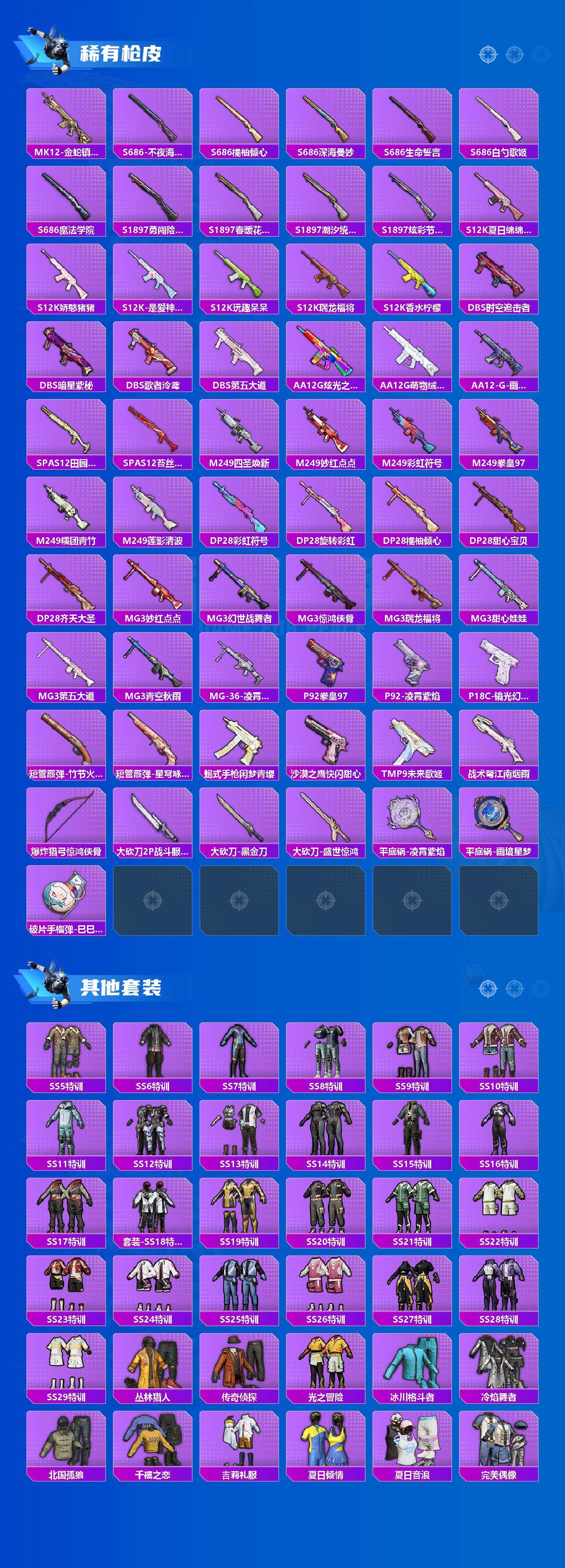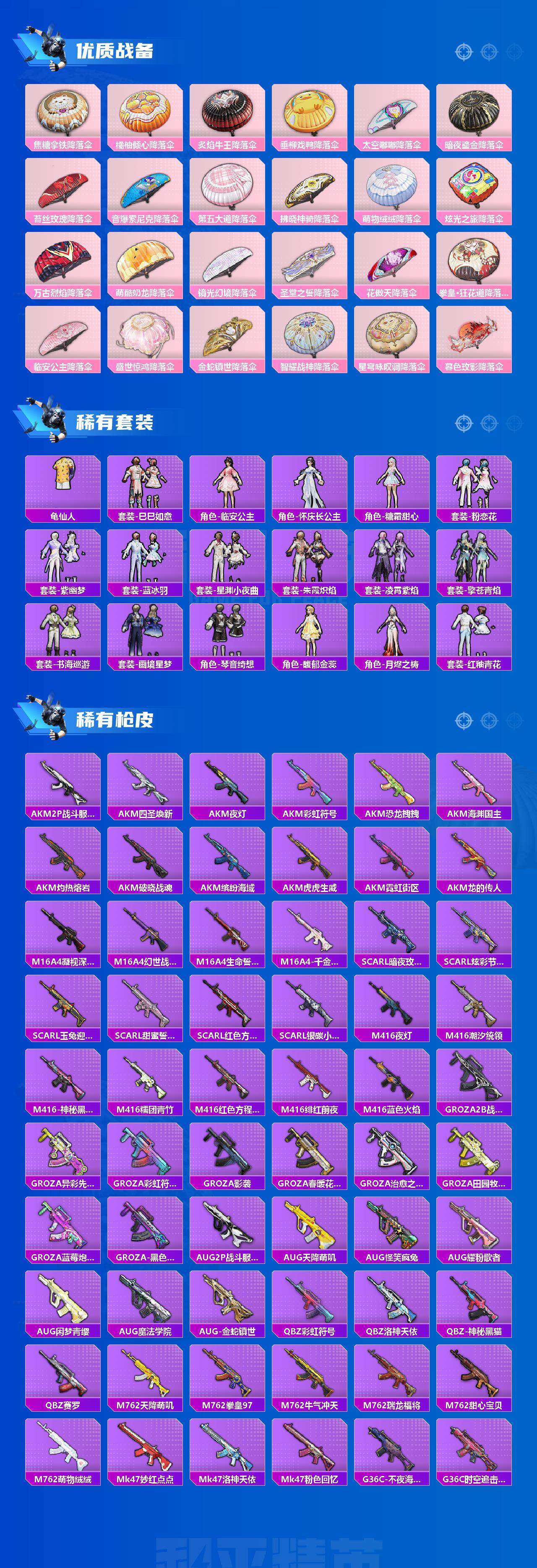AKM-星际浪客,SCAR-L-天蓬元帅,M416-五爪金龙,GROZA-焦糖拿铁,M762-甜心娃娃,汤姆逊-冰川粉黛,Kar98K-巳巳如意,DP-28-千金淑猫,MG3-洛神天依