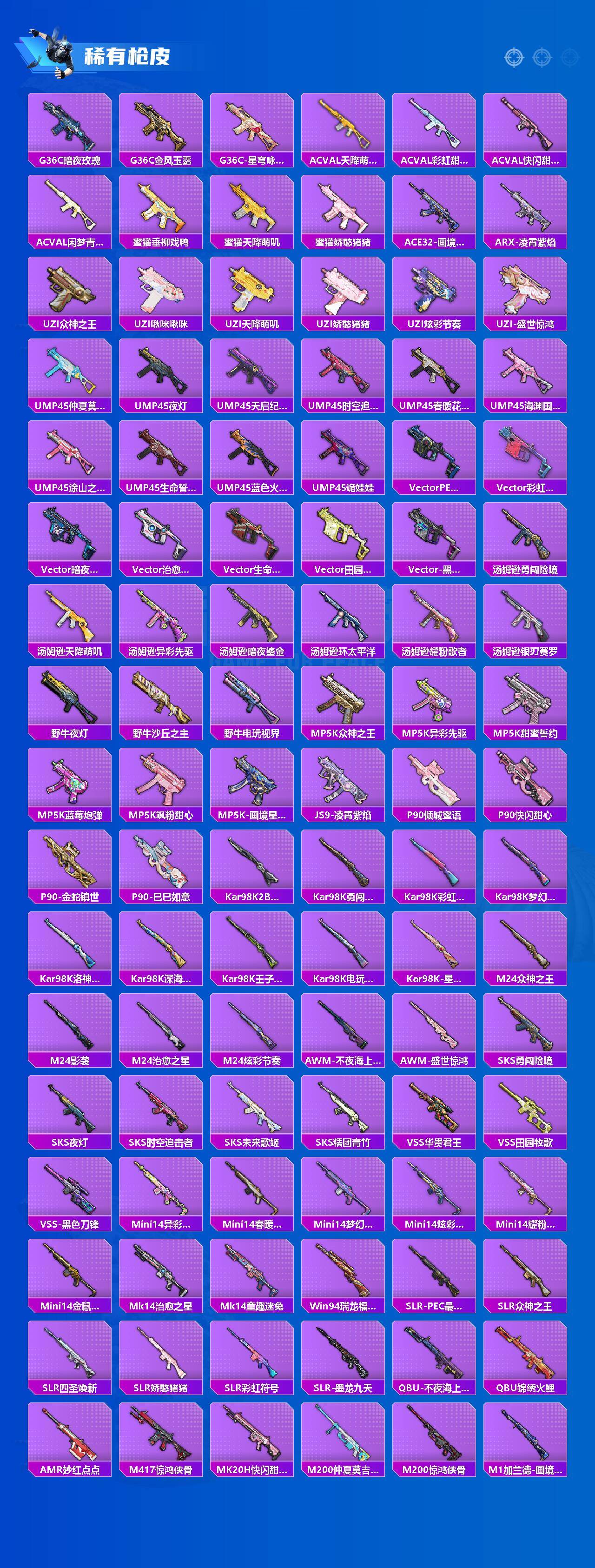 【粉色枪皮】:AKM-星际浪客,SCAR-L-天蓬元帅,M416-五爪金龙,GROZA-焦糖拿铁,M762-甜心娃娃,汤姆逊-冰川粉黛,AKS-74U-森灵之息,Kar98K-巳巳如意,Mk14-福马献瑞,AMR-智耀战神,DP-28-千金淑猫,DP-28-豹影疾电,MG3-洛神天依,MG-36-沧焰双生