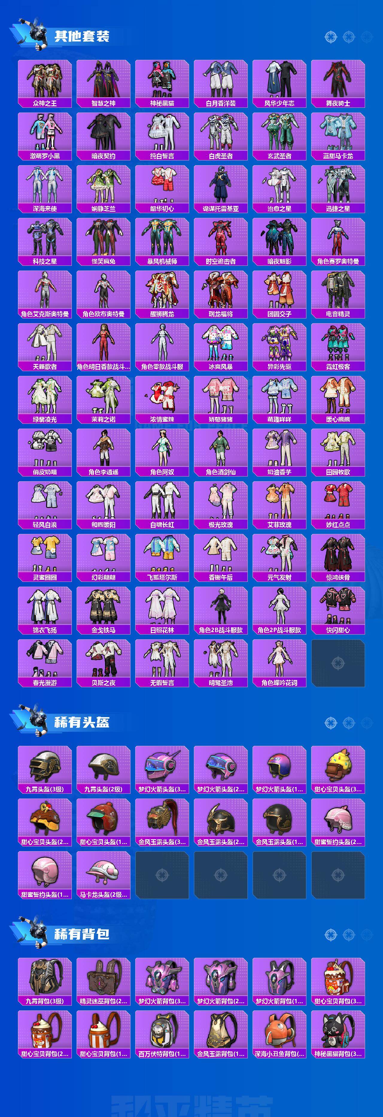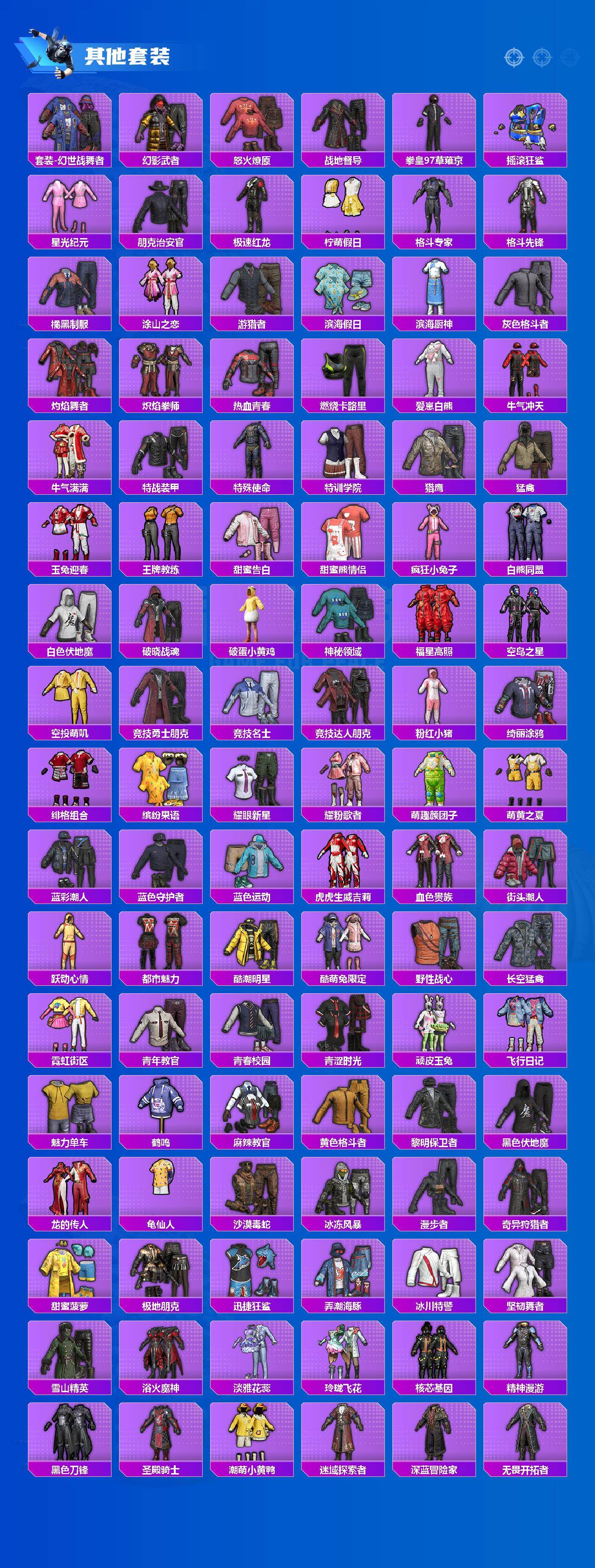 【粉色套装】:粉装-深海曼妙,粉装-宝贝奶油派,粉装-天使彩虹糖,粉装-梦幻火箭,粉装-缤纷油彩,粉装-草莓生巧,粉装-暗夜玫瑰,角色-洛天依,粉装-海渊国主,角色-2号机款机体服,粉装-精灵娃娃,粉装-赤焰黑爵,粉装-旋转彩虹,粉装-冰川红玫,粉装-寒光使者,粉装-音爆索尼克,角色-猩猩队长,粉装-萌物绒绒,粉装-炫光之旅,角色-蔷薇星,玩偶服-猪猪侠,角色-樱桃泡泡,角色-霁蓝缠春